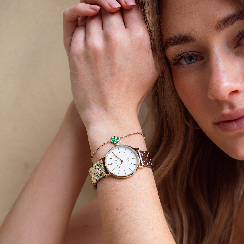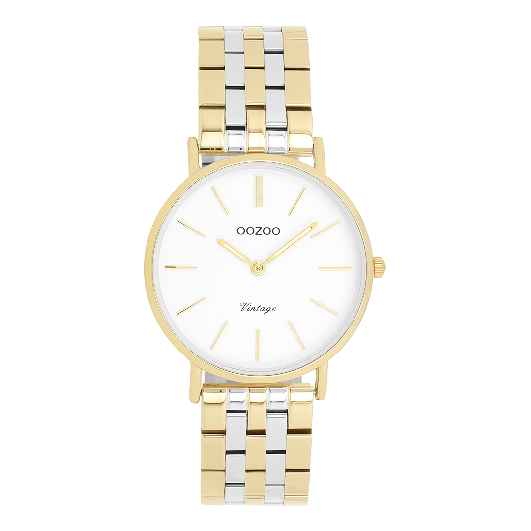 The classic look stays key in this trendy series and therefore, this round OOZOO vintage design with a playful wink is the season must-have! This unisex watch is the perfect combination of fashion and comfort with its 32 mm gold coloured metal watch case and white dial. The bicolor silver coloured/gold stainless steel bracelet makes this watch a trendy accessory, which you can wear every day. The dial has gold coloured stripes digits and matching hands. The C20407 adds the sparkle to your outfit. The mineral glass lays in a mm slim metal watch case with IP-plating. This design has a stainless steel backplate and is nickel safe. This watch has a 2ATM Japanese movement and is covered by a 2 year warranty (see section 3 of our Refund, shipping & warranty policy).