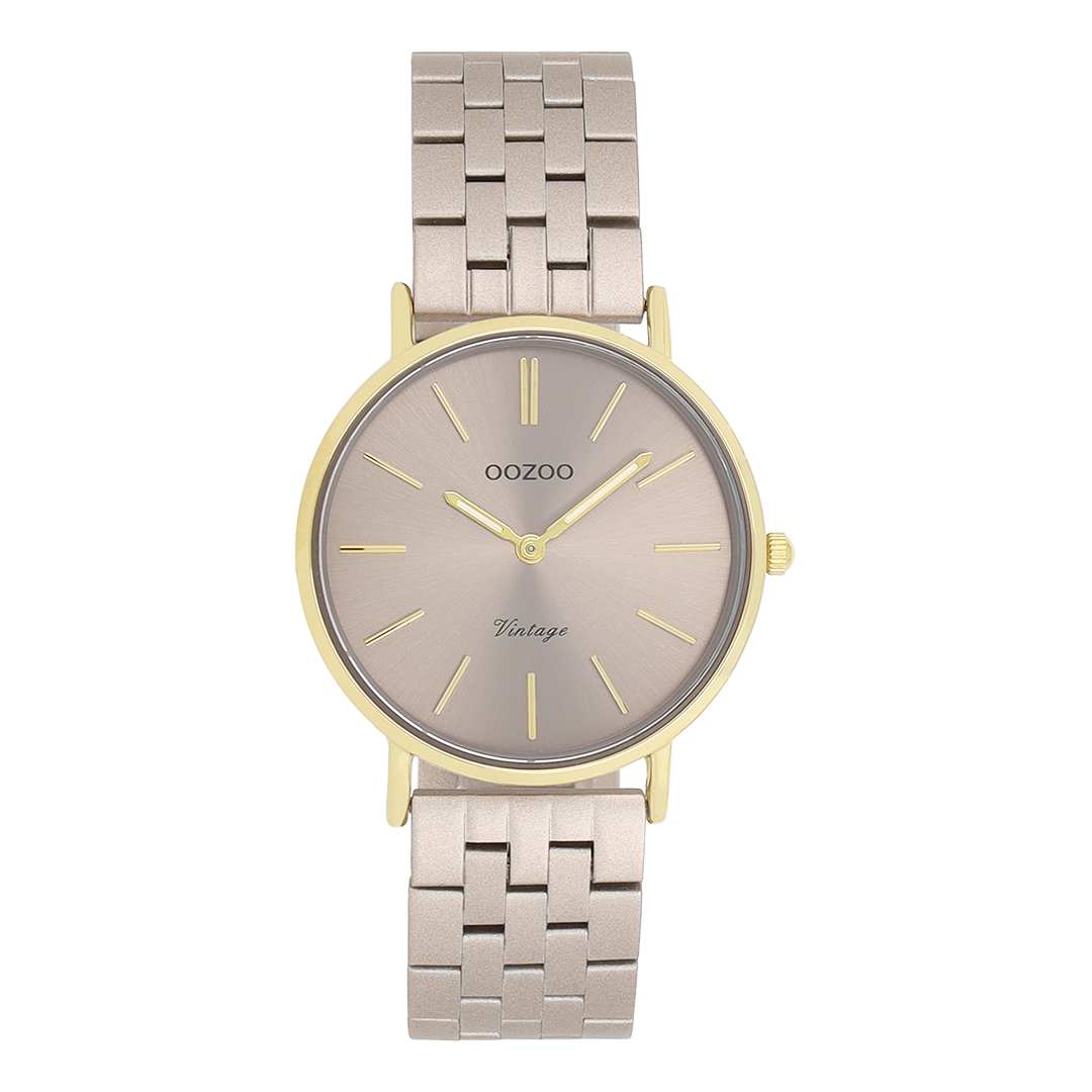 The classic look stays key in this trendy series and therefore, this round OOZOO vintage design with a playful wink is the season must-have! This unisex watch is the perfect combination of fashion and comfort with its 32 mm gold coloured metal watch case and taupe sunray dial. The matte taupe stainless steel bracelet makes this watch a trendy accessory, which you can wear every day. The dial has gold coloured stripes digits and matching hands. The C20409 adds the sparkle to your outfit. The mineral glass lays in a mm slim metal watch case with IP-plating. This design has a stainless steel backplate and is nickel safe. This watch has a 2ATM Japanese movement and is covered by a 2 year warranty (see section 3 of our Refund, shipping & warranty policy).
