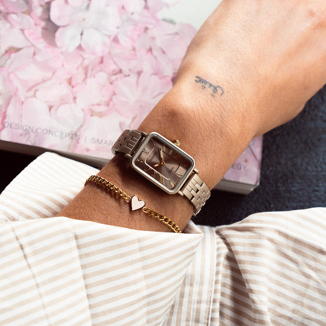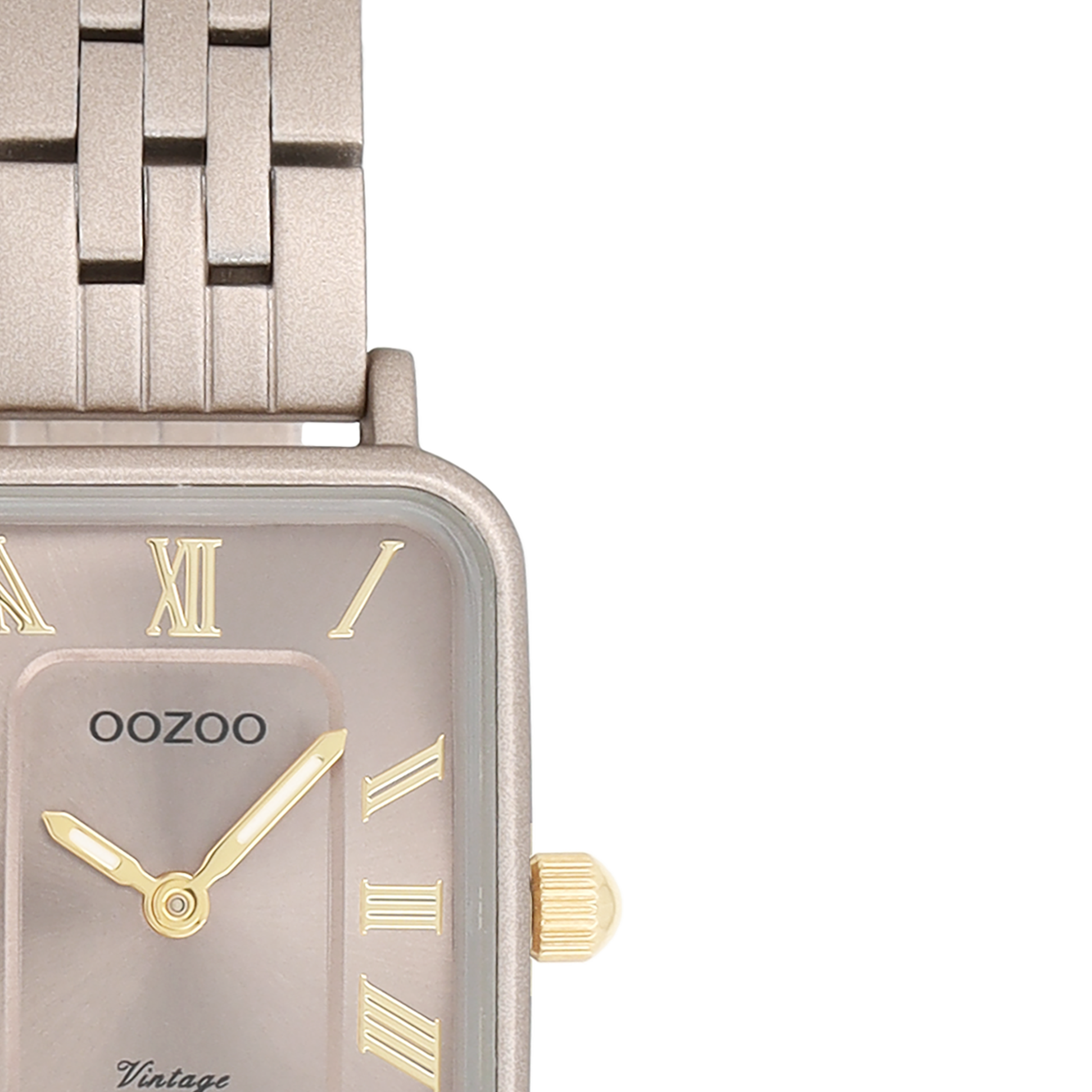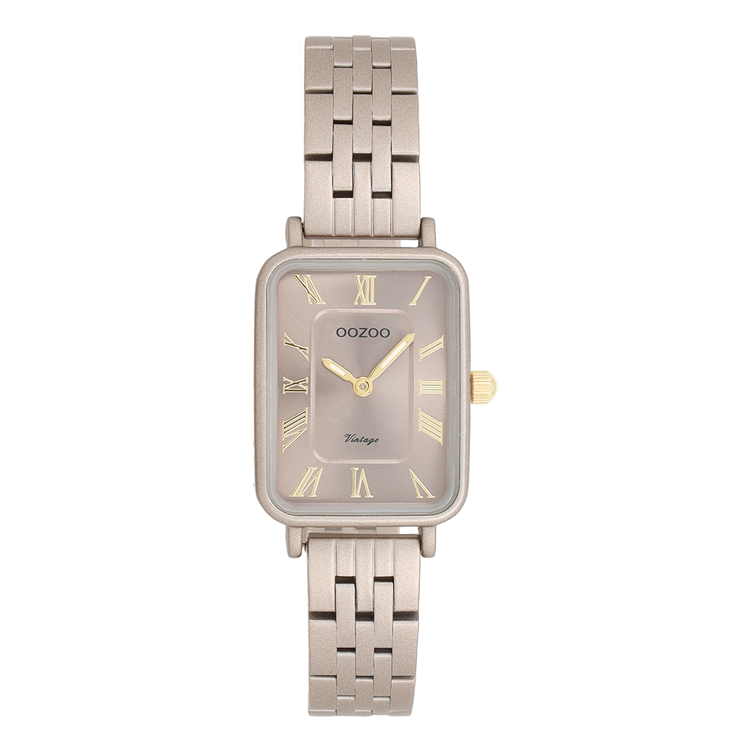 The classic look stays key in this trendy series and therefore, this rectangle OOZOO vintage design with a playful wink is the season must-have! This unisex watch is the perfect combination of fashion and comfort with its 24x28 mm taupe metal watch case and taupe sunray dial. The matte taupe stainless steel bracelet makes this watch a trendy accessory, which you can wear every day. The dial has gold coloured Roman numerals digits and matching hands. The C20412 adds the sparkle to your outfit. The mineral glass lays in a mm slim metal watch case with IP-plating. This design has a stainless steel backplate and is nickel safe. This watch has a 2ATM Japanese movement and is covered by a 2 year warranty (see section 3 of our Refund, shipping & warranty policy).
