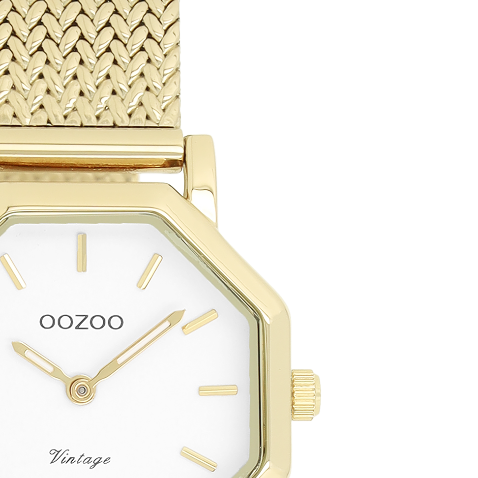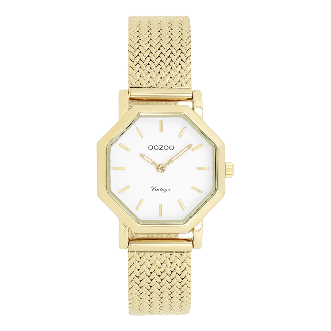 The classic look stays key in this trendy series and therefore, this octagon OOZOO vintage design with a playful wink is the season must-have! This ladies watch is the perfect combination of fashion and comfort with its 28x28 mm gold coloured metal watch case and white dial. The gold coloured metal v-mesh bracelet makes this watch a trendy accessory, which you can wear every day. The dial has gold coloured stripes digits and matching hands. The C20436 adds the sparkle to your outfit. The mineral glass lays in a mm slim metal watch case with IP-plating. This design has a stainless steel backplate and is nickel safe. This watch has a 2ATM Japanese movement and is covered by a 2 year warranty (see section 3 of our Refund, shipping & warranty policy).