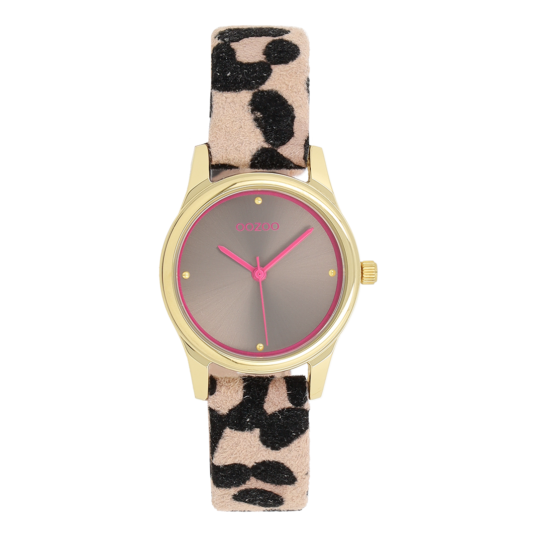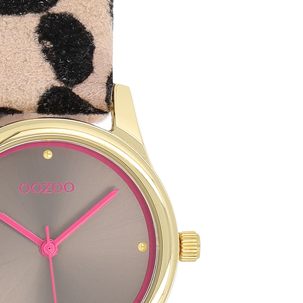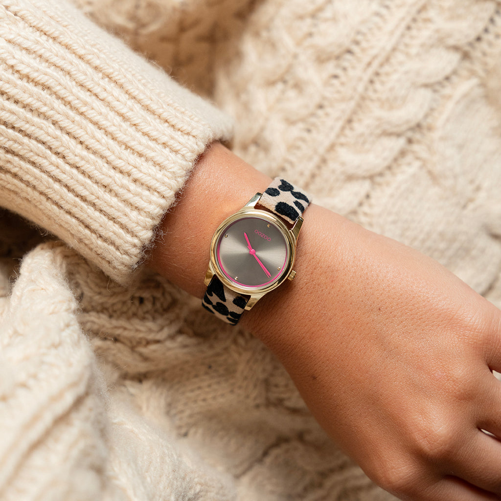 Stand out with this beautiful round ladies design from the trendy OOZOO Timepieces collection. The C11626 has a leopard print brown/black leather strap and 28 mm gold coloured metal watch case. You are making quite the fashion statement with this taupe sunray dial, gold coloured dots digits and fluo pink hands. This essential watch for your wardrobe has a mineral glass, stainless steel backplate and is nickel safe. This watch has a 2ATM Japanese movement and is covered by a 2 year warranty (see section 3 of our Refund, shipping & warranty policy).