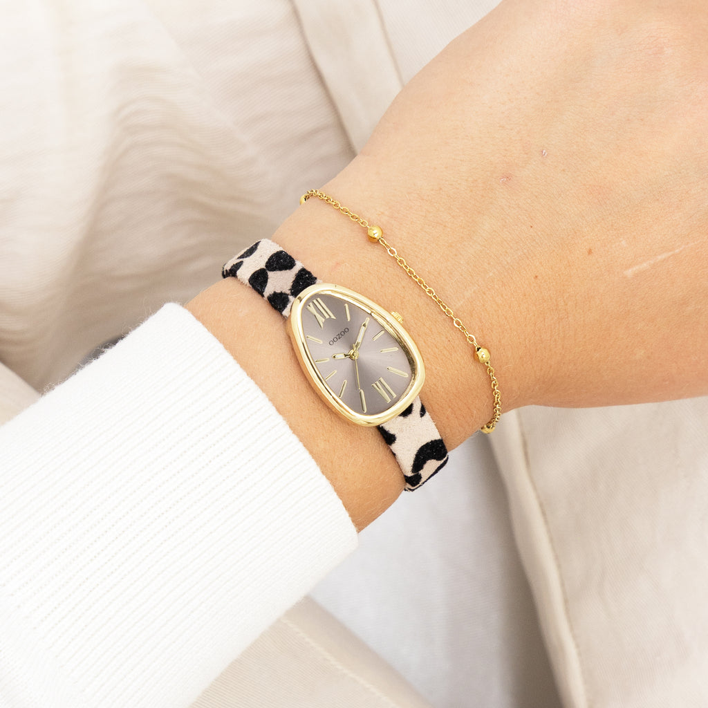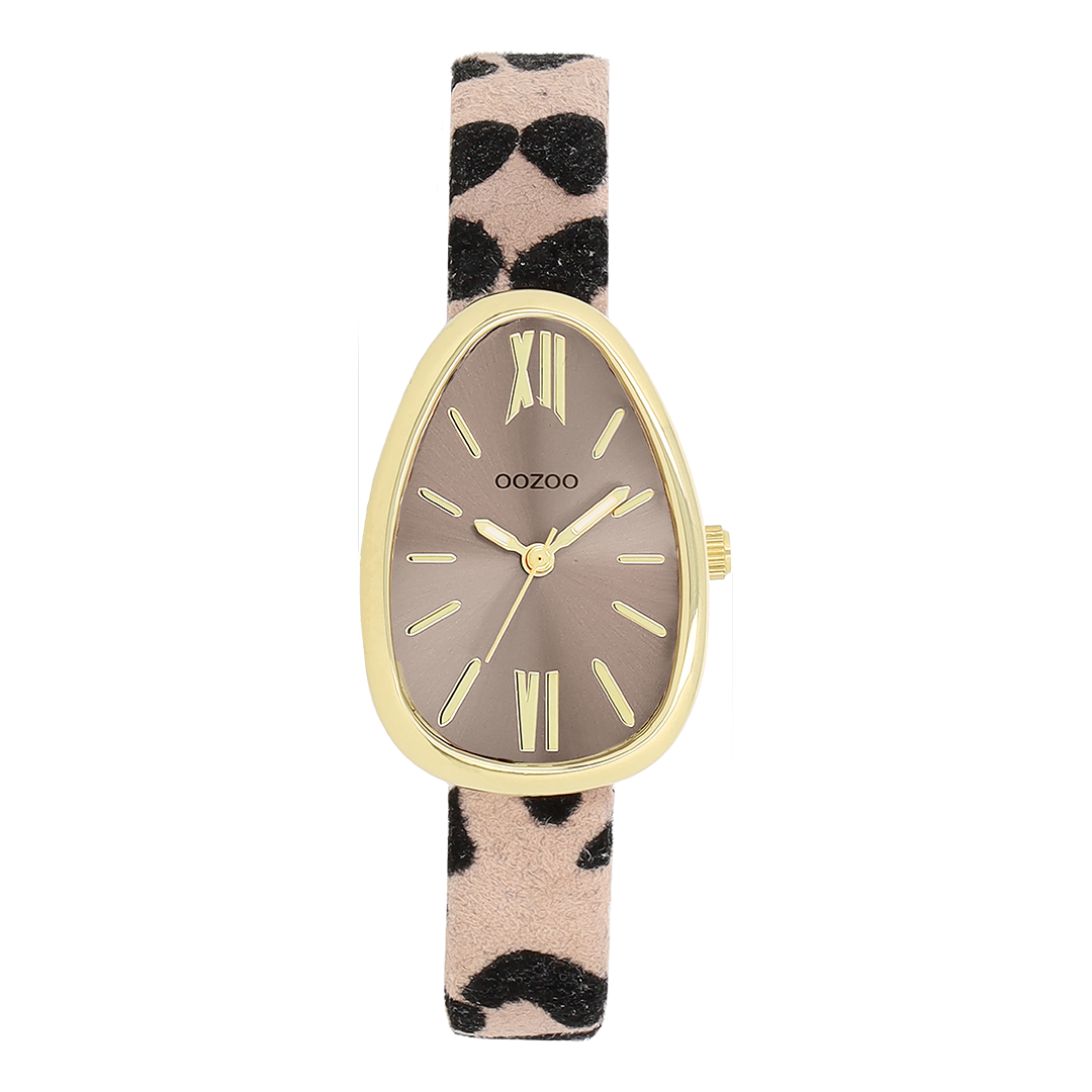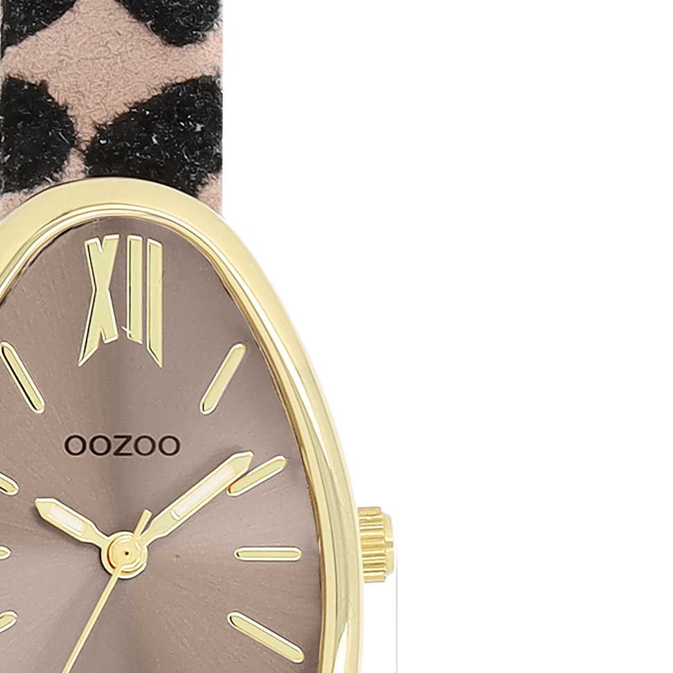 Stand out with this beautiful egg-shape ladies design from the trendy OOZOO Timepieces collection. The C11638 has a leopard print brown/black leather strap and 31x22 mm gold coloured metal watch case. You are making quite the fashion statement with this taupe sunray dial, gold coloured stripes and Roman numerals digits and matching hands. This essential watch for your wardrobe has a mineral glass, stainless steel backplate and is nickel safe. This watch has a 2ATM Japanese movement and is covered by a 2 year warranty (see section 3 of our Refund, shipping & warranty policy).