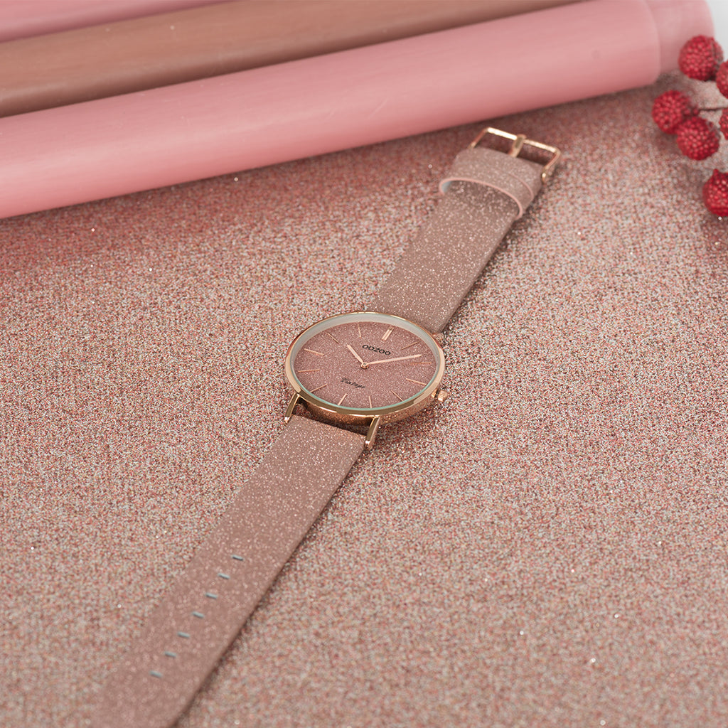The classic look stays key in this trendy series and therefore, this round OOZOO vintage design with a playful wink is the season must-have! This ladies watch is the perfect combination of fashion and comfort with its 40 mm rose coloured metal watch case and old pink with glitter dial. The glitter old pink leather strap makes this watch a trendy accessory, which you can wear every day. The dial has rose coloured stripes digits and matching hands. The C20161 adds the sparkle to your outfit. The mineral glass lays in a 6,9 mm slim metal watch case with IP-plating. This design has a stainless steel backplate and is nickel safe. This watch has a 2ATM Japanese movement and is covered by a 2 year warranty (see section 3 of our Refund, shipping & warranty policy).