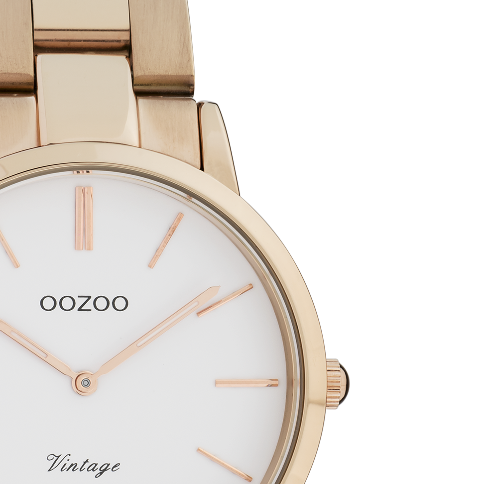 Sophistication and elegance are two elements of our beautiful OOZOO Vintage Classics. This classic round design with a contemporary twist is something for everyone. This unisex watch is the perfect combination of comfort and fashion with its 34 mm rose gold coloured metal watch case and white dial. The matte/shiny rose gold coloured stainless steel bracelet makes this watch an all-time classic which you can wear with every occasion. The dial has rose gold coloured stripes digits and matching hands. The C20048 is a must have for your every-wear. The mineral glass lays in a 6,9 mm slim metal watch case with IP-plating. This design has a stainless steel backplate and is nickel safe. This watch has a 2 Japanese movement and is covered by a 2 year warranty (see section 3 of our Refund, shipping & warranty policy).