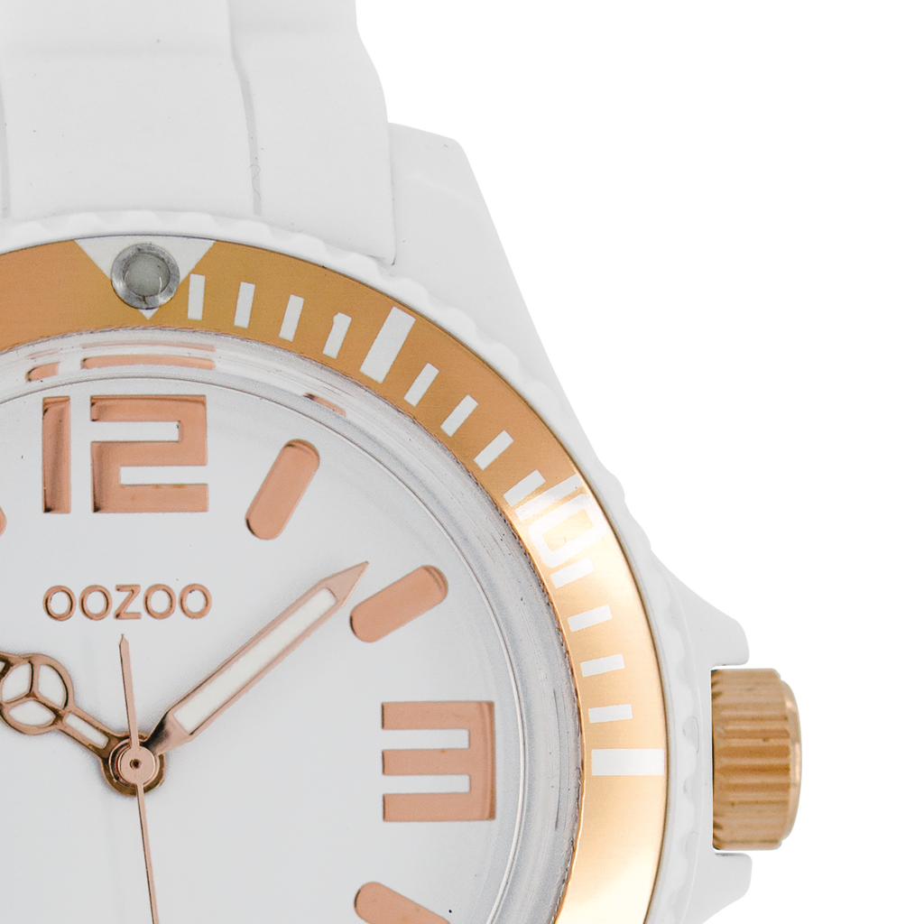 Stand out with this beautiful round unisex design from the trendy OOZOO Timepieces collection. The C4171 has a white rubber strap and 43 mm white plastic watch case. You are making quite the fashion statement with this white dial, rose gold coloured stripes and numbers digits and rose gold coloured/white hands. This essential watch for your wardrobe has a mineral glass, stainless steel backplate and is nickel safe. This watch has a 2 Japanese movement and is covered by a 2 year warranty (see section 3 of our Refund, shipping & warranty policy).