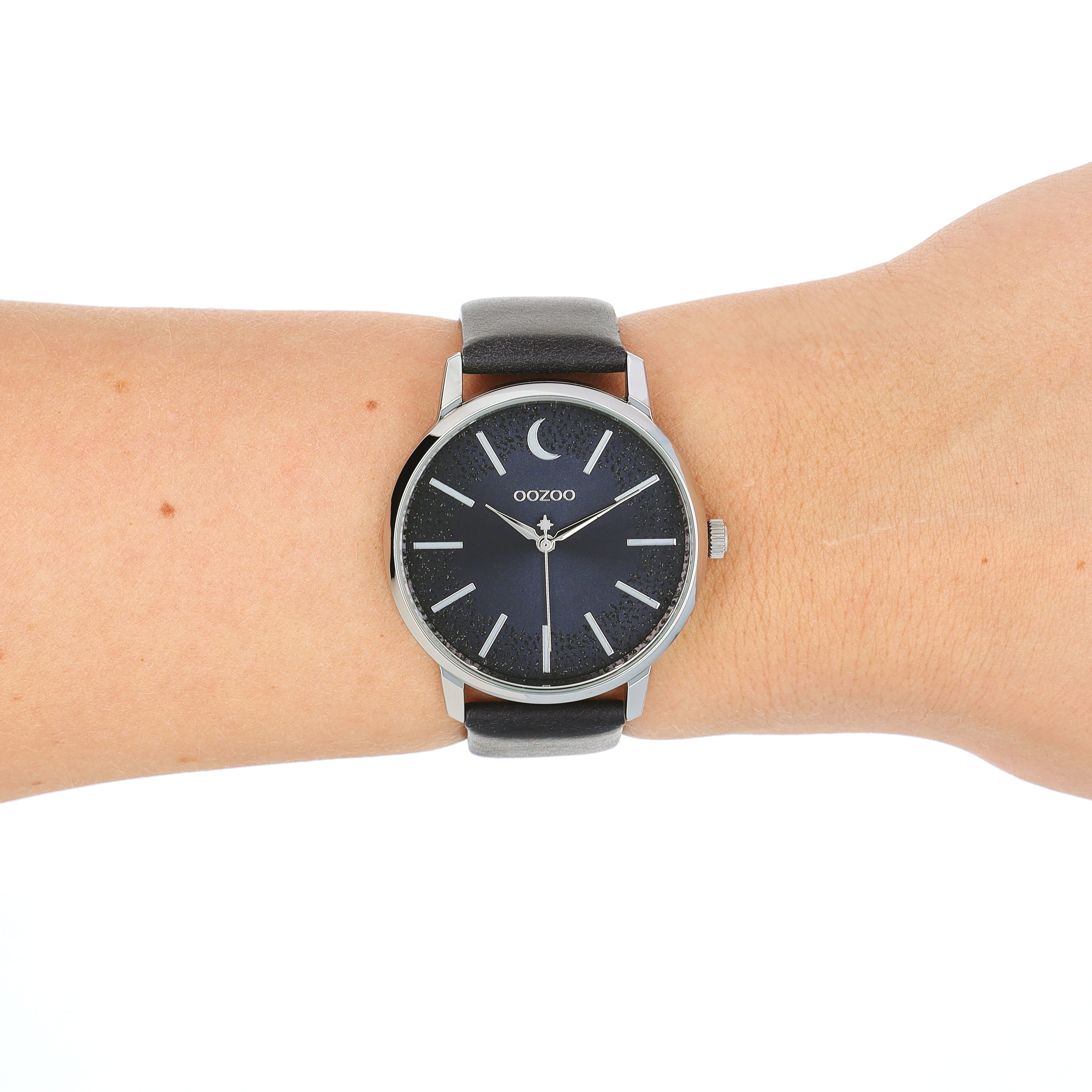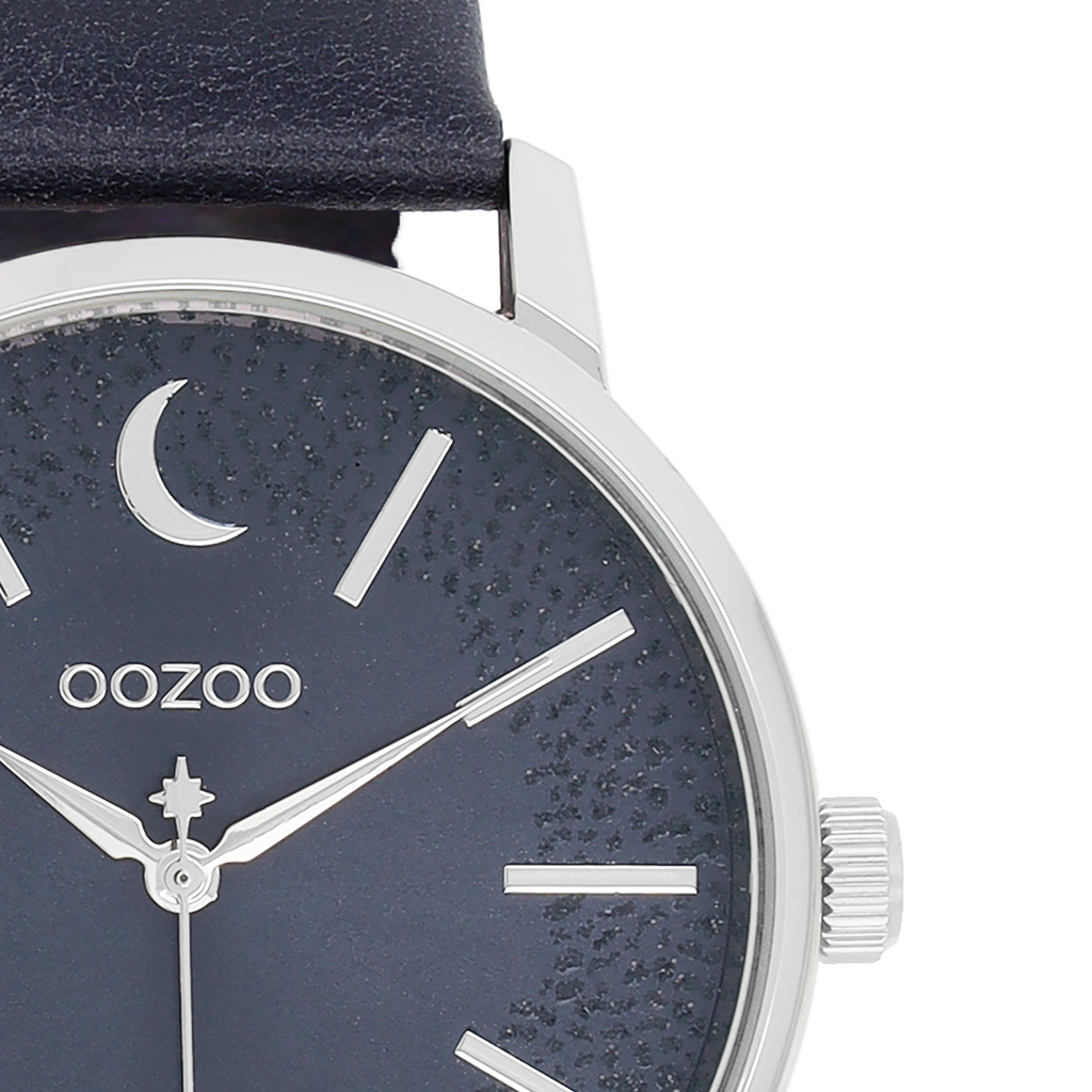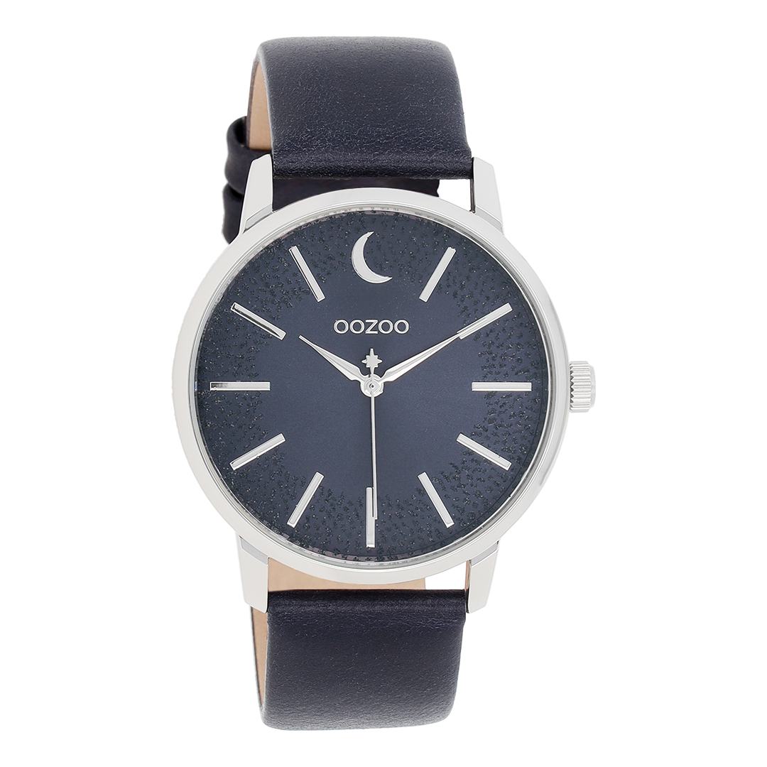 OOZOO Montre en couleur argent avec bracelet en cuir en bleu foncé - C11043
