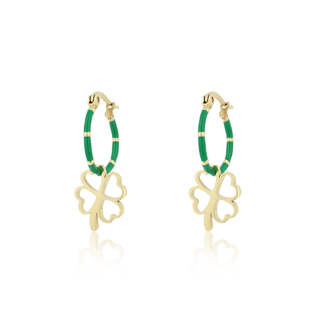 Boucles d'oreilles créoles en vert avec un charme de trèfle or