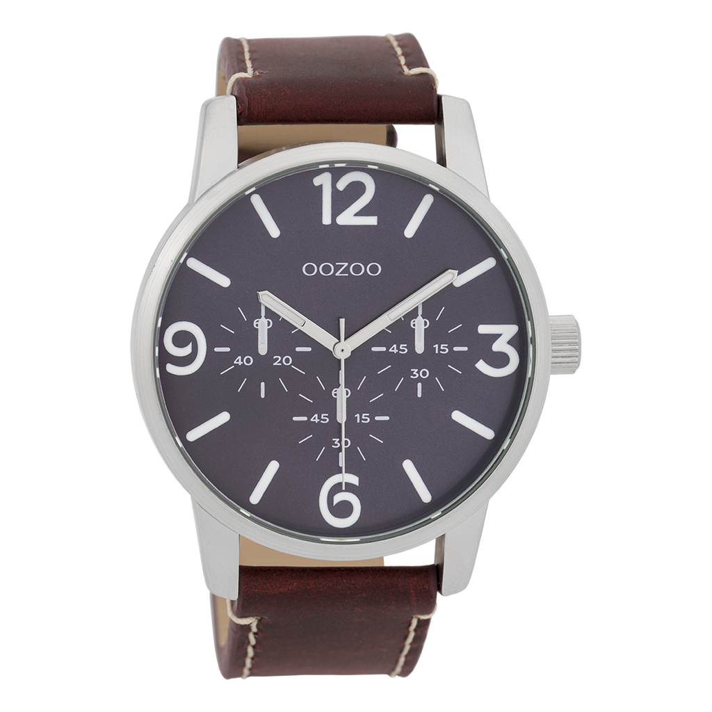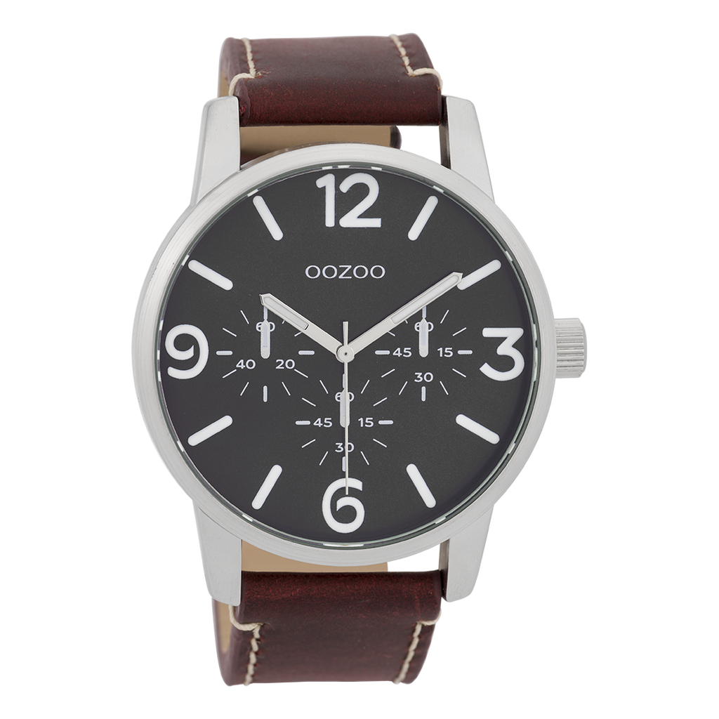 Silver coloured OOZOO watch with red brown leather strap - C9651