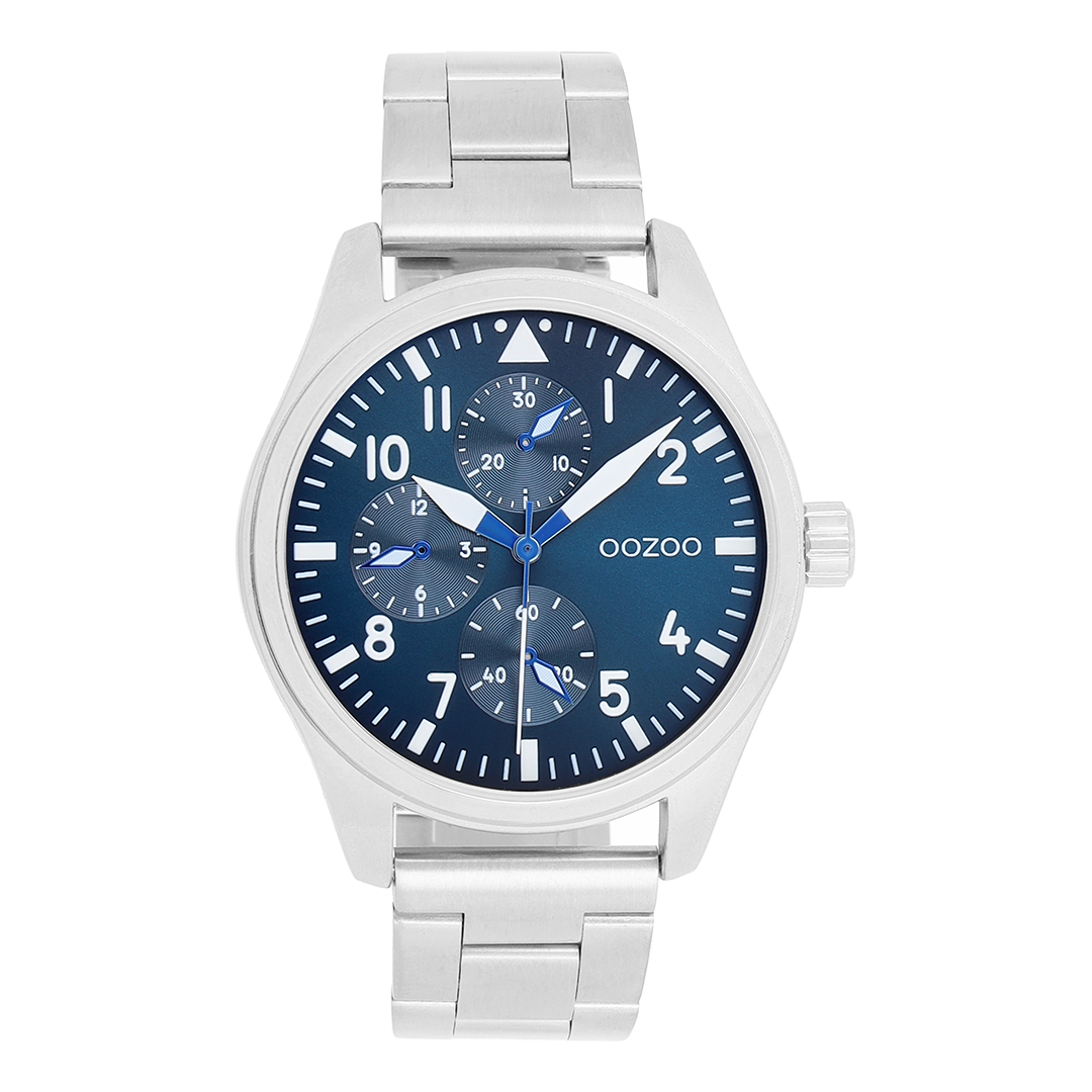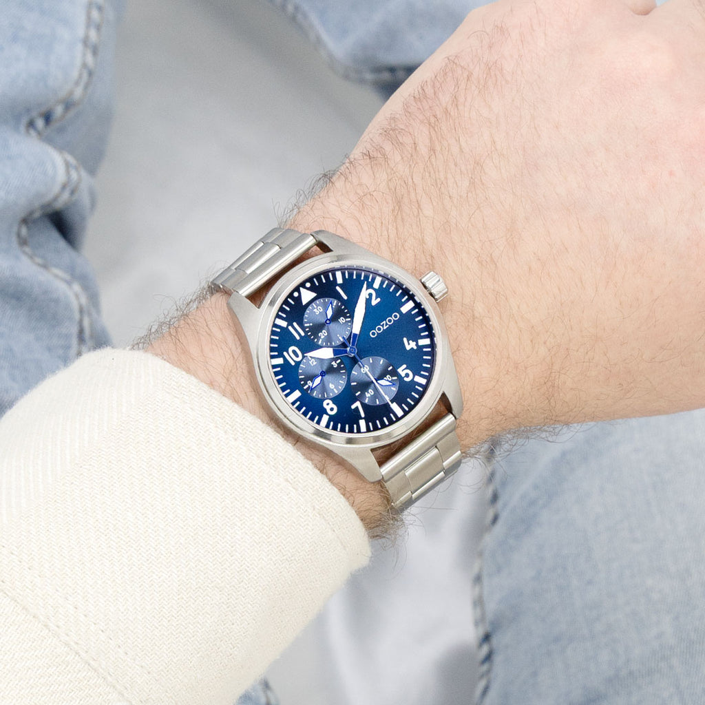 Stand out with this beautiful round gents design from the trendy OOZOO Timepieces collection. The C11505 has a matte silver coloured stainless steel bracelet and 42 mm silver coloured metal watch case. You are making quite the fashion statement with this blue chrono/sunray dial, white stripes and numbers digits and white/blue hands. This essential watch for your wardrobe has a mineral glass, stainless steel backplate and is nickel safe. This watch has a 2ATM Japanese movement and is covered by a 2 year warranty (see section 3 of our Refund, shipping & warranty policy).
