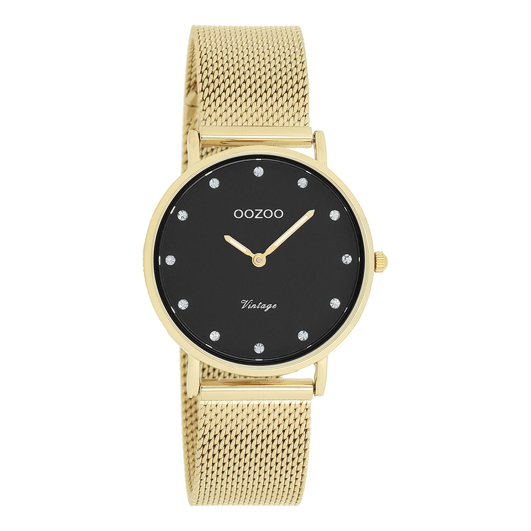 The classic look stays key in this trendy series and therefore, this round OOZOO vintage design with a playful wink is the season must-have! This unisex watch is the perfect combination of fashion and comfort with its 32 mm gold coloured metal watch case and black dial. The gold coloured metal mesh bracelet makes this watch a trendy accessory, which you can wear every day. The dial has white rhinestones digits and gold coloured hands. The C20242 adds the sparkle to your outfit. The mineral glass lays in a 6,9 mm slim metal watch case with IP-plating. This design has a stainless steel backplate and is nickel safe. This watch has a 2 Japanese movement and is covered by a 2 year warranty (see section 3 of our Refund, shipping & warranty policy).