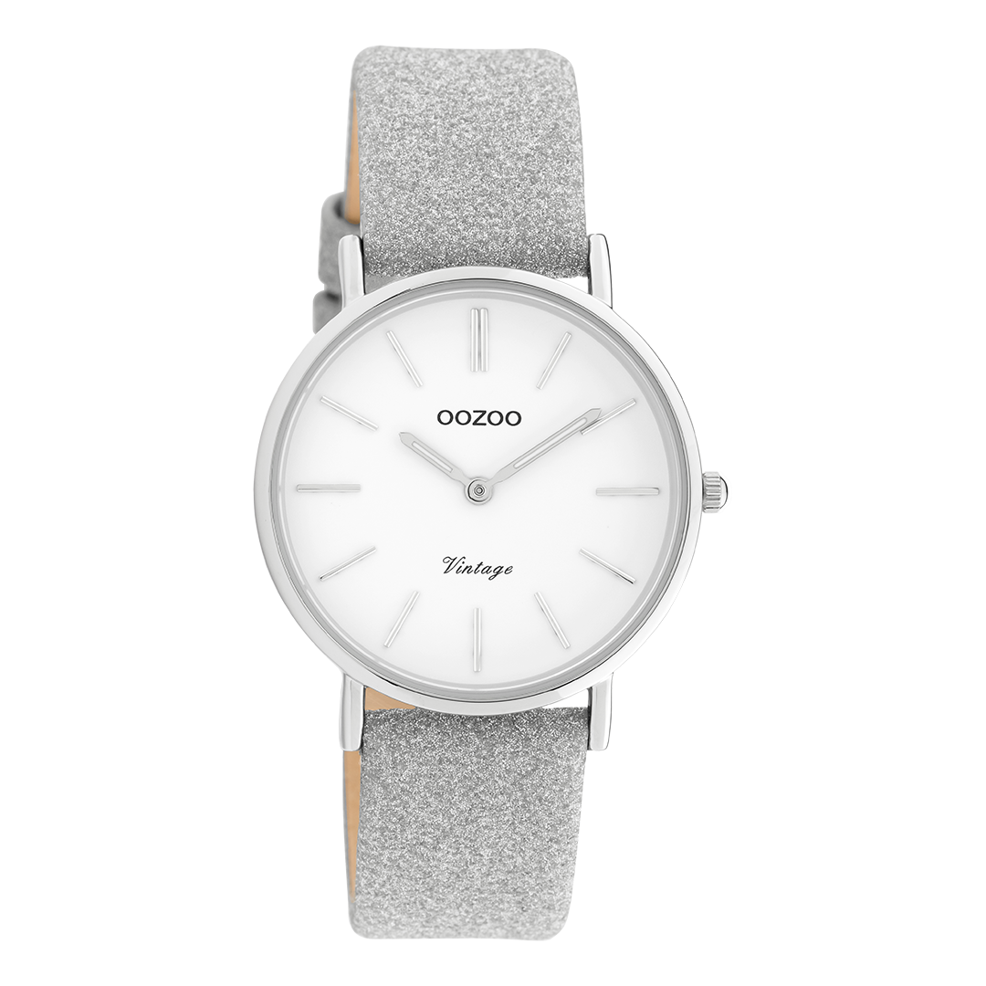 The classic look stays key in this trendy series and therefore, this round OOZOO vintage design with a playful wink is the season must-have! This unisex watch is the perfect combination of fashion and comfort with its 32 mm silver coloured metal watch case and white dial. The glitter silver coloured leather strap makes this watch a trendy accessory, which you can wear every day. The dial has silver coloured stripes digits and matching hands. The C20155 adds the sparkle to your outfit. The mineral glass lays in a 6,9 mm slim metal watch case with IP-plating. This design has a stainless steel backplate and is nickel safe. This watch has a 2 Japanese movement and is covered by a 2 year warranty (see section 3 of our Refund, shipping & warranty policy).
