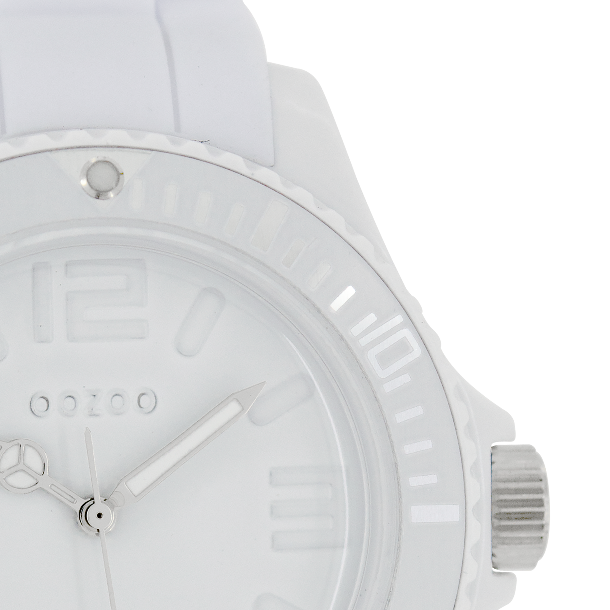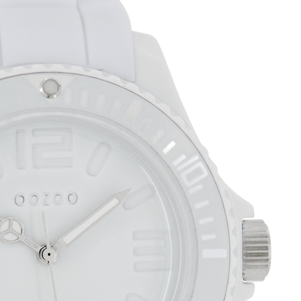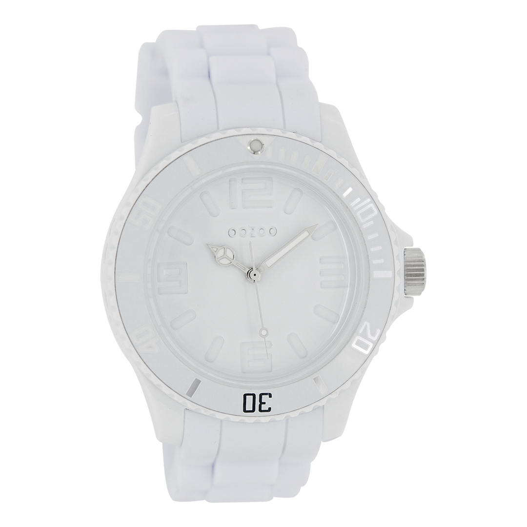 Stand out with this beautiful round unisex design from the trendy OOZOO Timepieces collection. The C4361 has a white rubber strap and 43 mm white plastic watch case. You are making quite the fashion statement with this white dial, white stripes and numbers digits and silver coloured/white hands. This essential watch for your wardrobe has a mineral glass, stainless steel backplate and is nickel safe. This watch has a 2 Japanese movement and is covered by a 2 year warranty (see section 3 of our Refund, shipping & warranty policy).