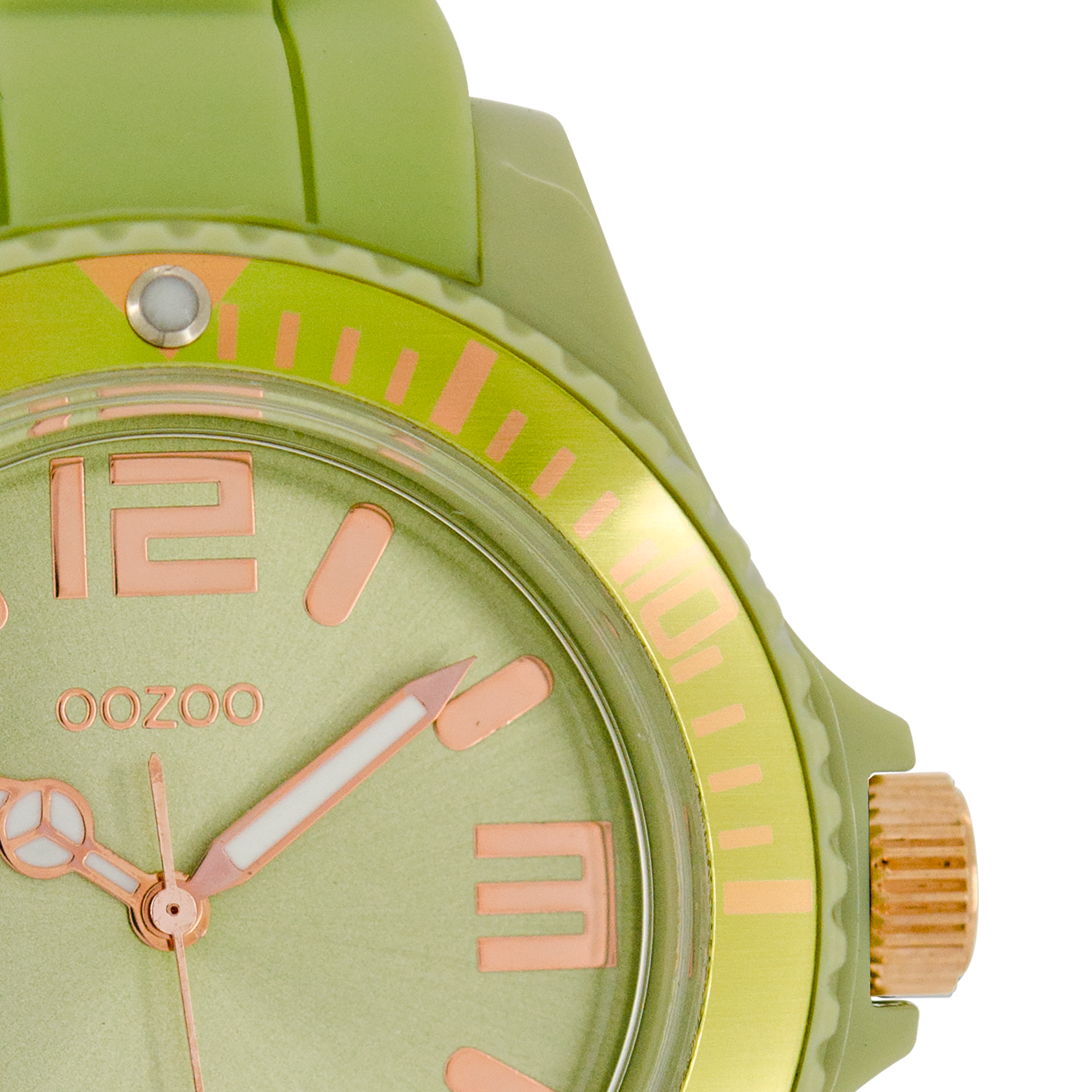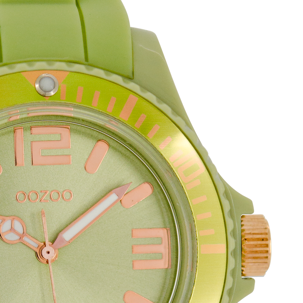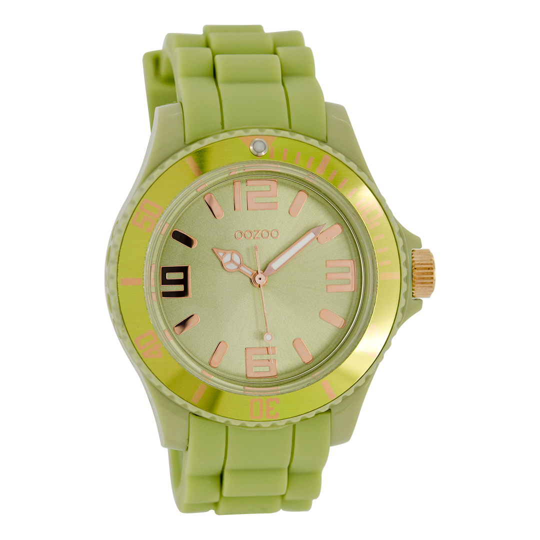 Stand out with this beautiful round unisex design from the trendy OOZOO Timepieces collection. The C4369 has a green rubber strap and 43 mm green plastic watch case. You are making quite the fashion statement with this green sunray dial, rose gold coloured stripes and numbers digits and rose gold coloured/white hands. This essential watch for your wardrobe has a mineral glass, stainless steel backplate and is nickel safe. This watch has a 2 Japanese movement and is covered by a 2 year warranty (see section 3 of our Refund, shipping & warranty policy).