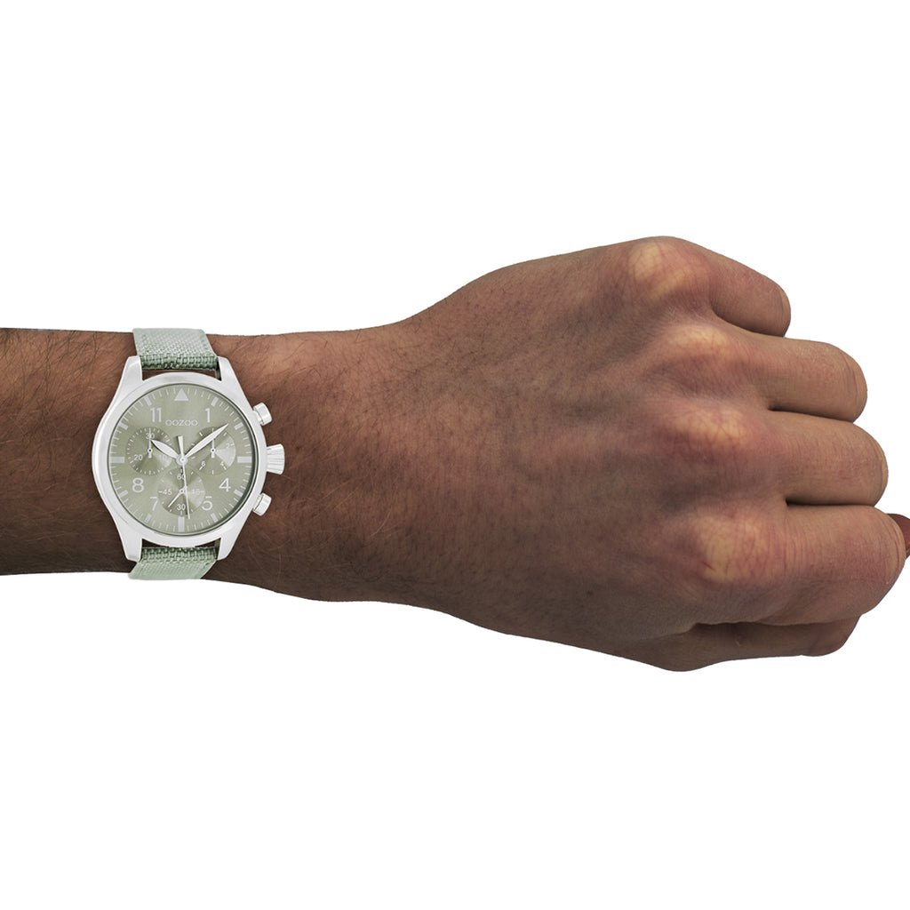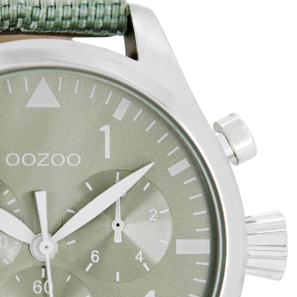 Stand out with this beautiful round gents design from the trendy OOZOO Timepieces collection. The C6795 has a stitched mint green NATO watch strap and 45 mm silver coloured metal watch case. You are making quite the fashion statement with this mint green chrono/sunray dial, silver coloured stripes and numbers digits and matching hands. This essential watch for your wardrobe has a mineral glass, stainless steel backplate and is nickel safe. This watch has a 2 Japanese movement and is covered by a 2 year warranty (see section 3 of our Refund, shipping & warranty policy).