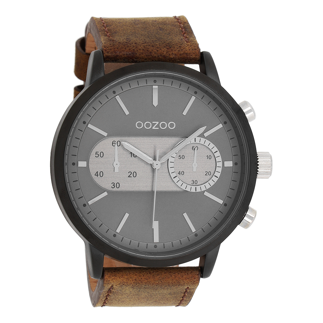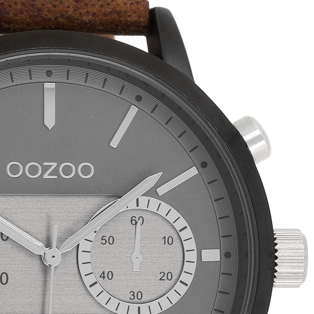 Stand out with this beautiful round gents design from the trendy OOZOO Timepieces collection. The C9057 has a brown leather strap and 50 mm black metal watch case. You are making quite the fashion statement with this dark grey chrono dial, silver coloured stripes digits and matching hands. This essential watch for your wardrobe has a mineral glass, stainless steel backplate and is nickel safe. This watch has a 2 Japanese movement and is covered by a 2 year warranty (see section 3 of our Refund, shipping & warranty policy).