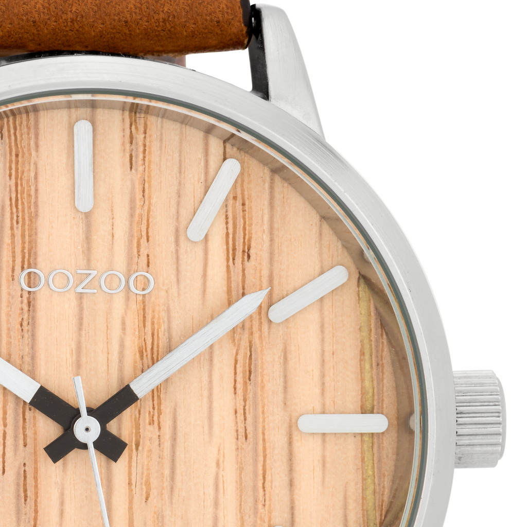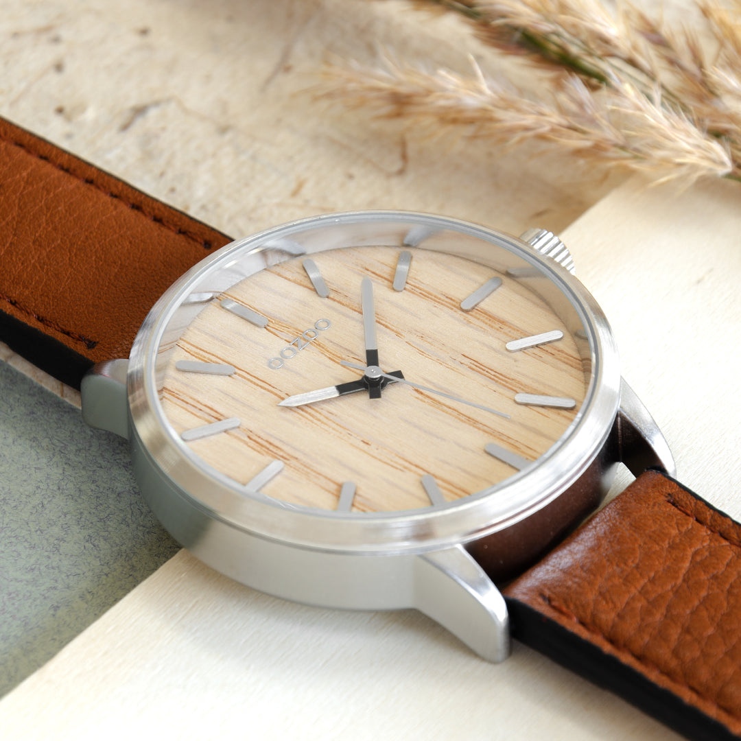 Silver coloured OOZOO watch with cognac leather strap - C9256