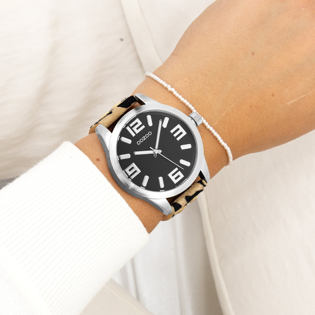 Val op met dit prachtige ronde dames design uit de trendy OOZOO Timepieces collectie. De C0901 heeft een luipaard print bruine leren band en 46 mm zilverkleurige metalen horlogekast. Maak een fashion statement met deze zwarte wijzerplaat, zilverkleurige strepen en cijfers tijdsaanduidingen en bijpassende wijzers. Dit horloge is een musthave voor jouw garderobe en heeft een mineraalglas, stainless steel achterplaat en is nikkel-safe. Dit horloge heeft een 2ATM Japans uurwerk en wordt gedekt door een garantie van 2 jaar (zie sectie 3 van onze Refund, shipping & warranty policy).