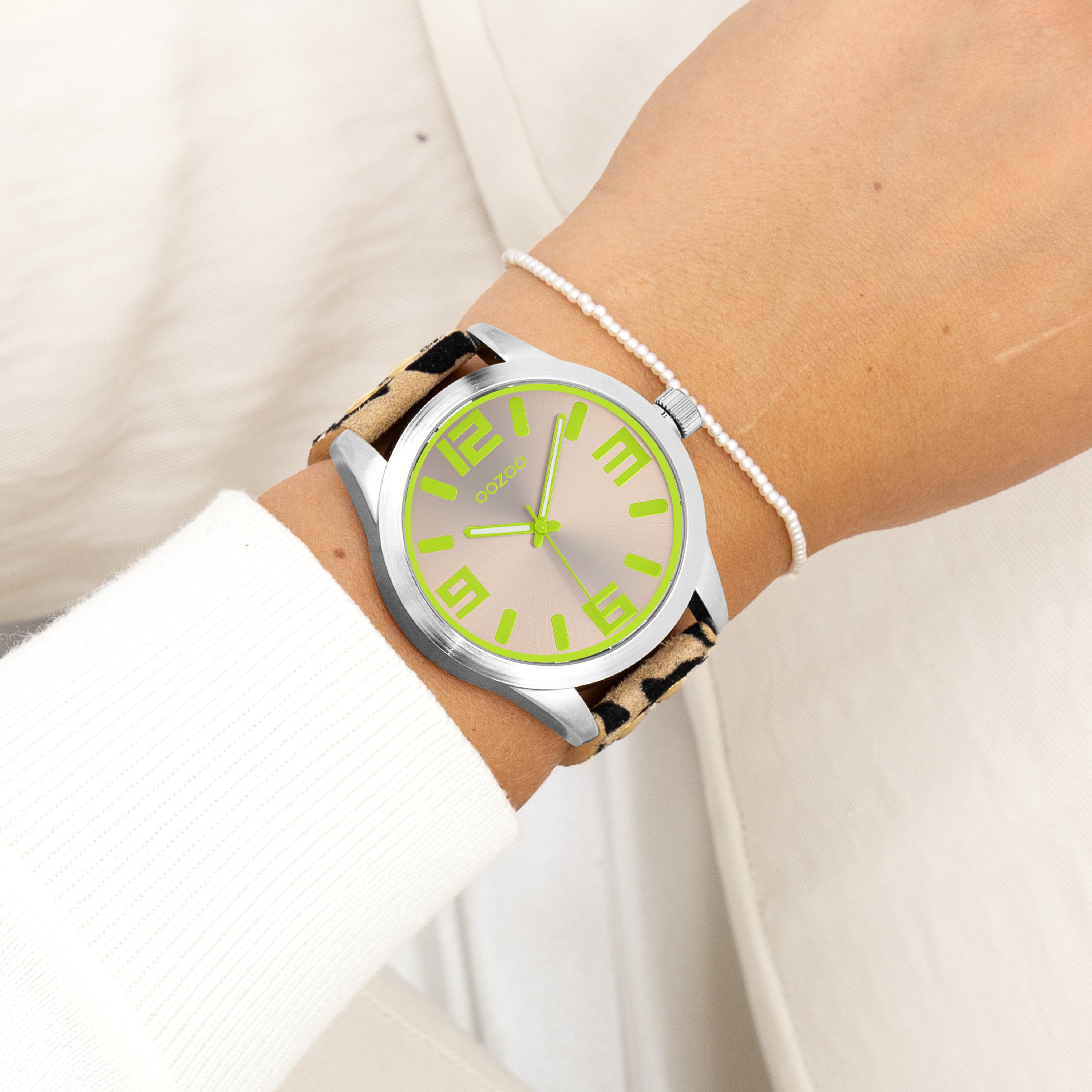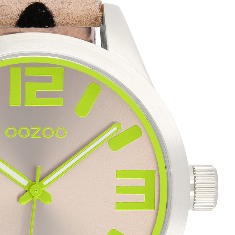 Val op met dit prachtige ronde dames design uit de trendy OOZOO Timepieces collectie. De C0902 heeft een luipaard print bruine leren band en 46 mm zilverkleurige metalen horlogekast. Maak een fashion statement met deze taupe sunray wijzerplaat, fluo groene strepen en cijfers tijdsaanduidingen en bijpassende wijzers. Dit horloge is een musthave voor jouw garderobe en heeft een mineraalglas, stainless steel achterplaat en is nikkel-safe. Dit horloge heeft een 2ATM Japans uurwerk en wordt gedekt door een garantie van 2 jaar (zie sectie 3 van onze Refund, shipping & warranty policy).