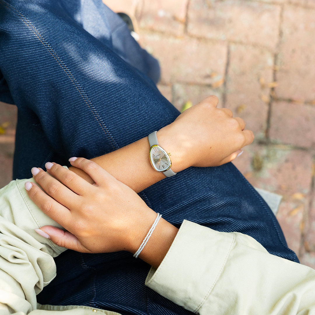 Stand out with this beautiful egg-shape ladies design from the trendy OOZOO Timepieces collection. The C11637 has a taupe leather strap and 31x22 mm gold coloured metal watch case. You are making quite the fashion statement with this taupe sunray dial, gold coloured stripes and Roman numerals digits and matching hands. This essential watch for your wardrobe has a mineral glass, stainless steel backplate and is nickel safe. This watch has a 2ATM Japanese movement and is covered by a 2 year warranty (see section 3 of our Refund, shipping & warranty policy).