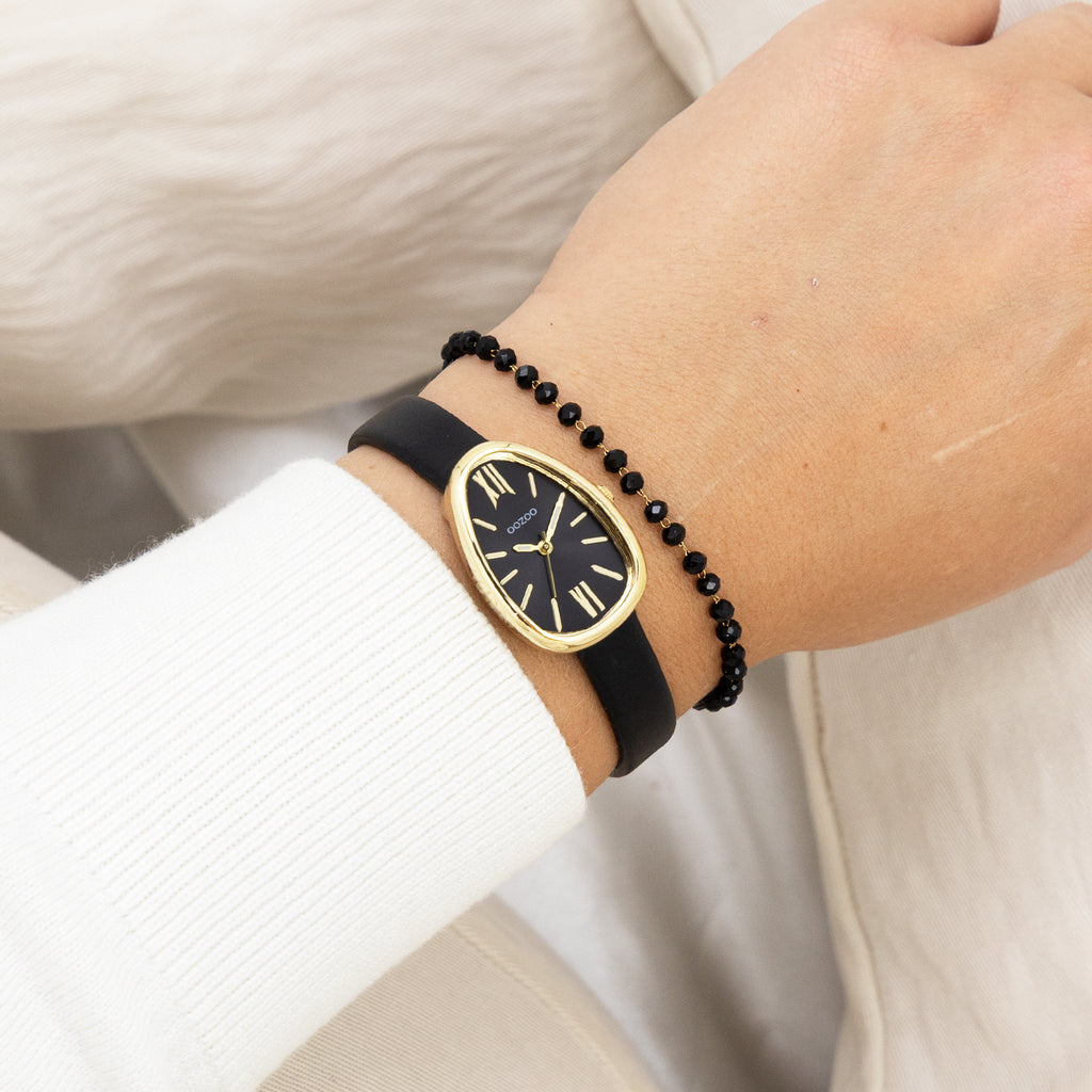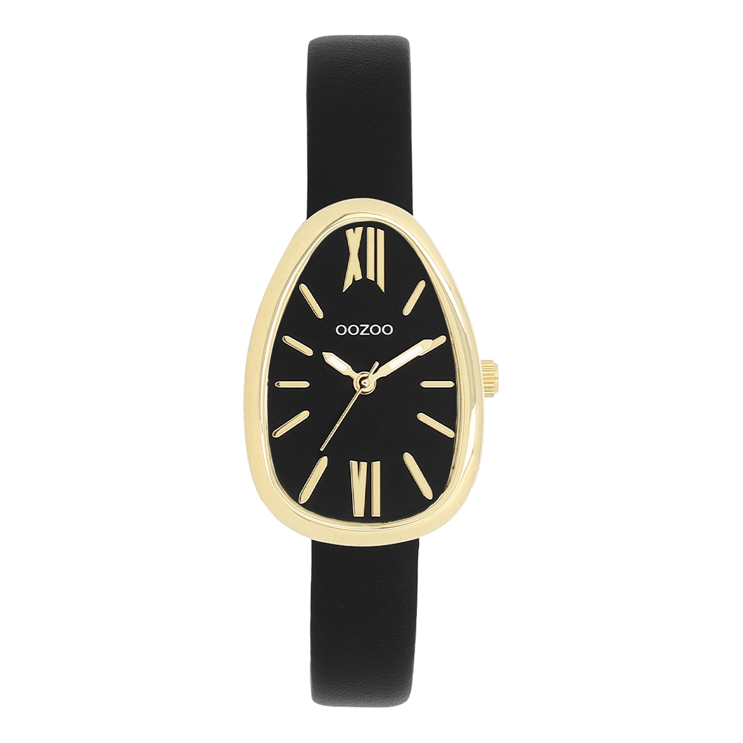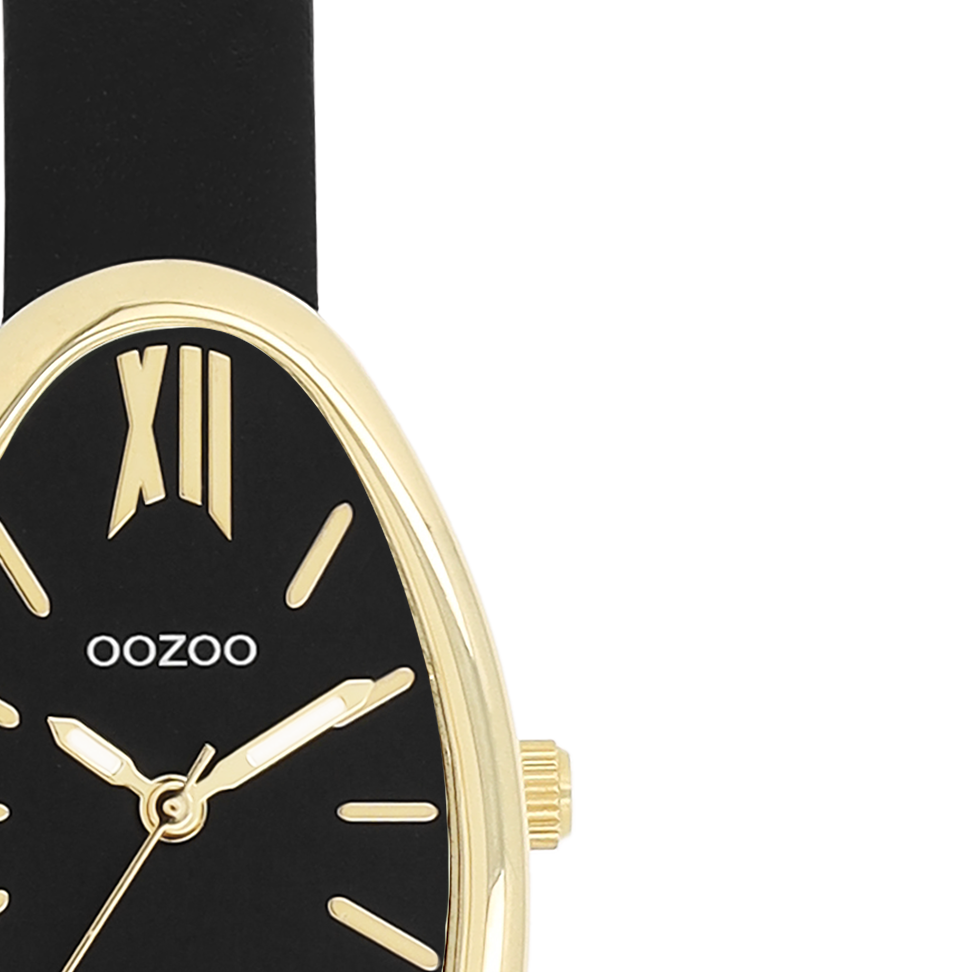 Stand out with this beautiful egg-shape ladies design from the trendy OOZOO Timepieces collection. The C11640 has a black leather strap and 31x22 mm gold coloured metal watch case. You are making quite the fashion statement with this black dial, gold coloured stripes and Roman numerals digits and matching hands. This essential watch for your wardrobe has a mineral glass, stainless steel backplate and is nickel safe. This watch has a 2ATM Japanese movement and is covered by a 2 year warranty (see section 3 of our Refund, shipping & warranty policy).