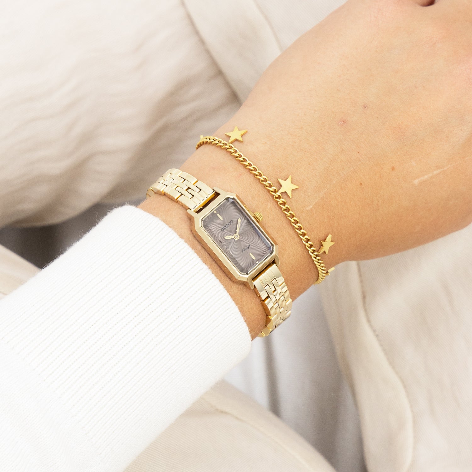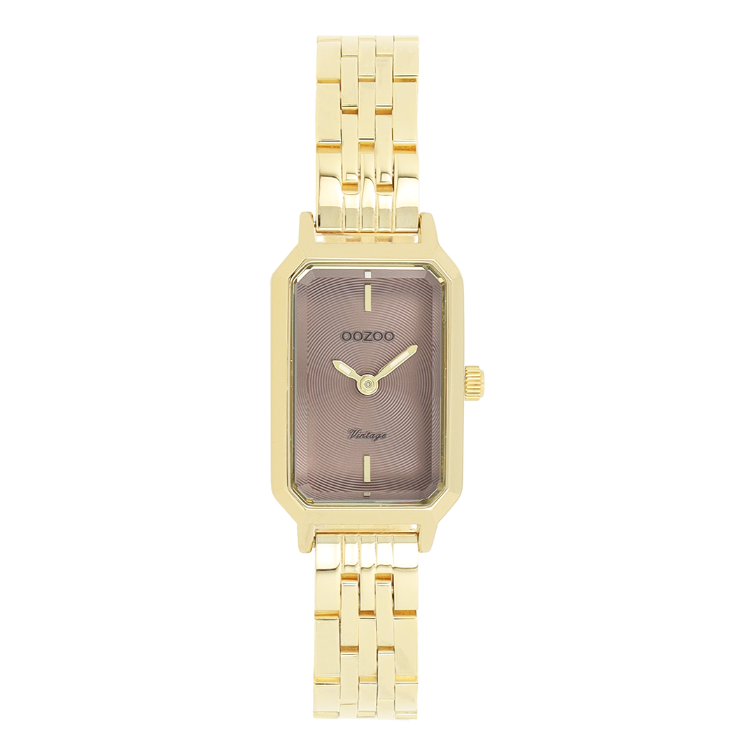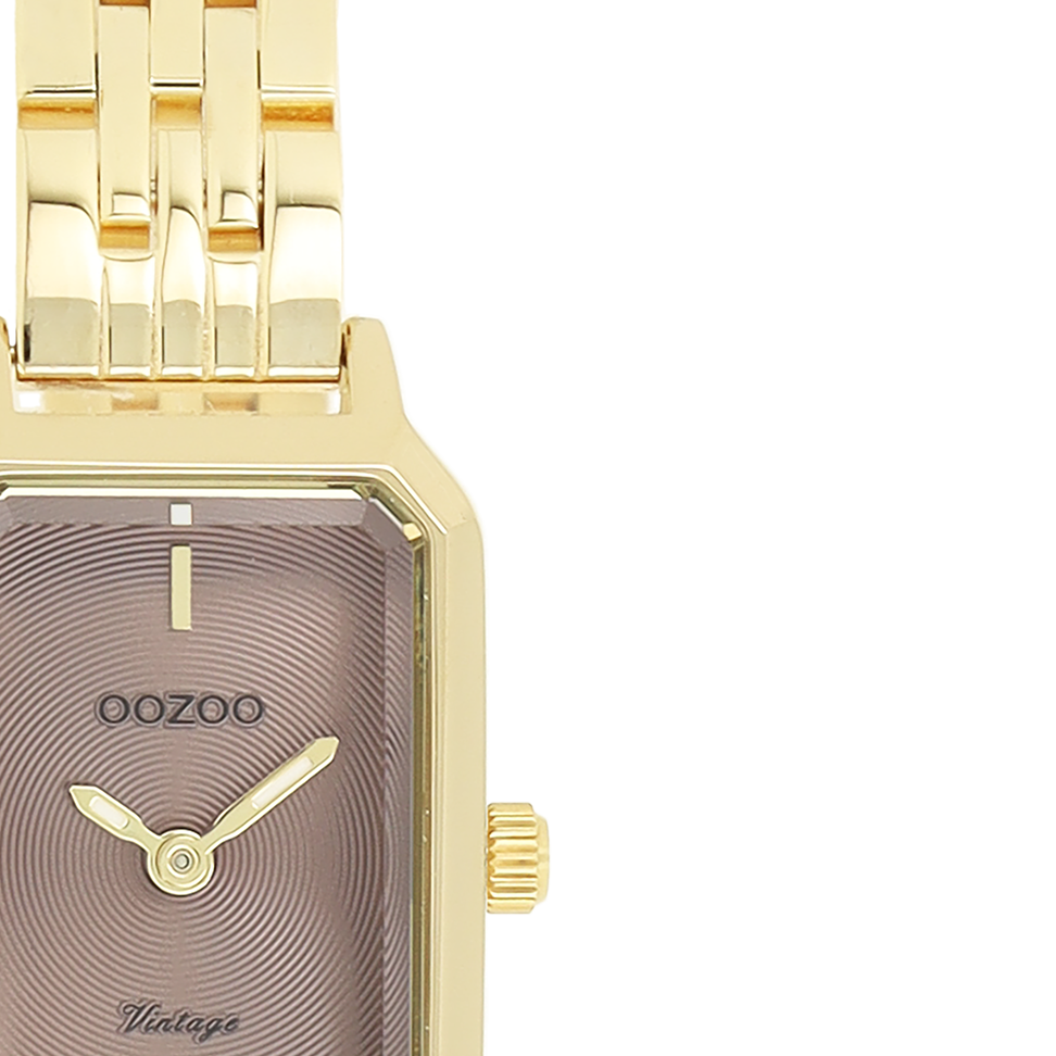 The classic look stays key in this trendy series and therefore, this rectangle OOZOO vintage design with a playful wink is the season must-have! This ladies watch is the perfect combination of fashion and comfort with its 22x19 mm gold coloured metal watch case and taupe sunray dial. The shiny gold coloured stainless steel bracelet makes this watch a trendy accessory, which you can wear every day. The dial has gold coloured stripes digits and matching hands. The C20428 adds the sparkle to your outfit. The mineral glass lays in a mm slim metal watch case with IP-plating. This design has a stainless steel backplate and is nickel safe. This watch has a 2ATM Japanese movement and is covered by a 2 year warranty (see section 3 of our Refund, shipping & warranty policy).