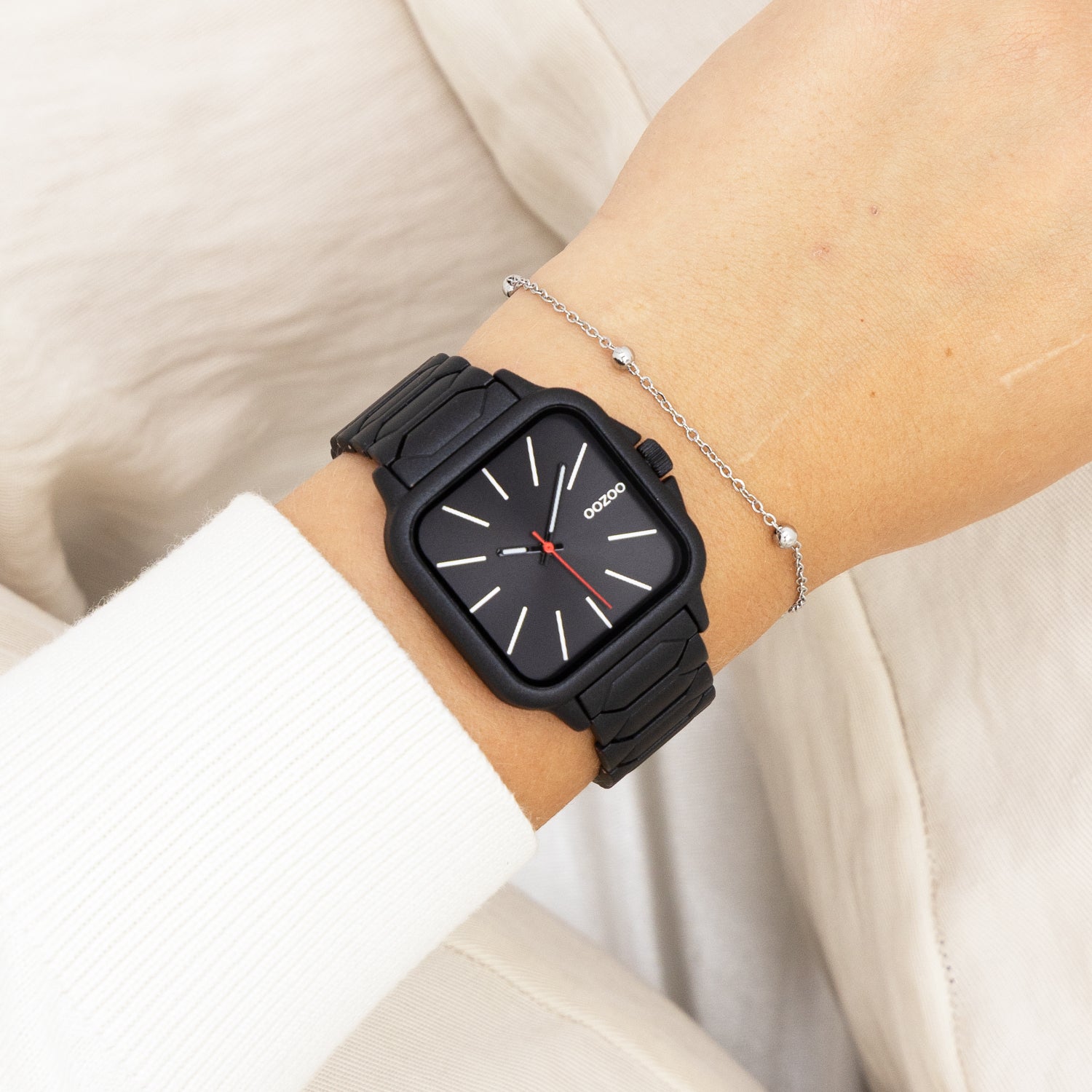 Stand out with this beautiful square unisex design from the trendy OOZOO Timepieces collection. The C11609 has a black stainless steel bracelet and 44 mm black matte watch case. You are making quite the fashion statement with this black sunray dial, white stripes digits and black/white/red hands. This essential watch for your wardrobe has a mineral glass, stainless steel backplate and is nickel safe. This watch has a 2ATM Japanese movement and is covered by a 2 year warranty (see section 3 of our Refund, shipping & warranty policy).
