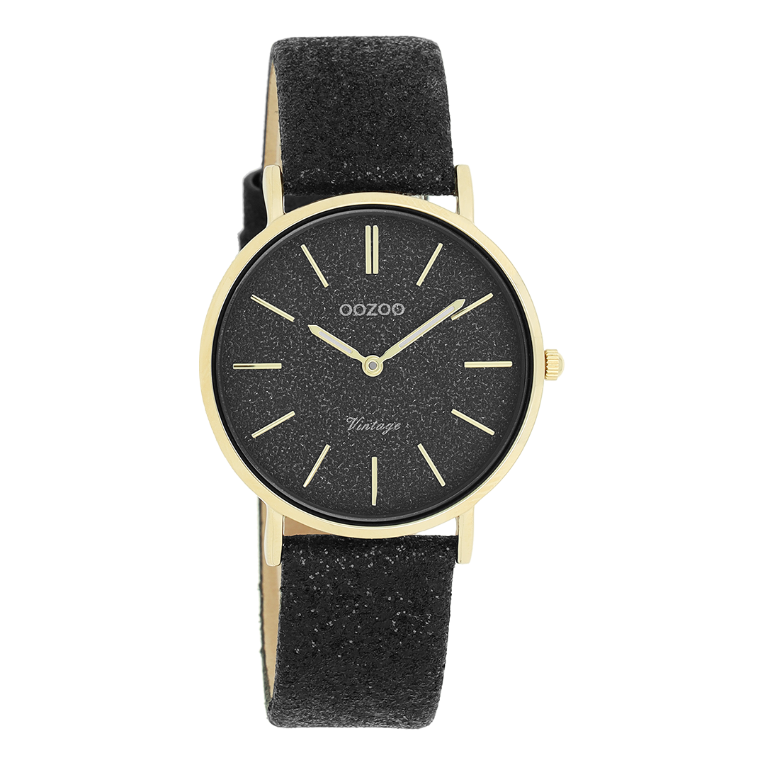 De klassieke look blijft centraal staan in deze trendy serie en daarom is dit OOZOO vintage ronde design met een speelse knipoog dé musthave van het seizoen! Dit dames horloge is de perfecte combinatie van comfort en fashion met zijn 32 mm goudkleurige metalen horlogekast en zwarte met glitter wijzerplaat. De wijzerplaat heeft goudkleurige strepen tijdsaanduidingen en bijpassende kleurige wijzers. De zwarte glitter leren band maakt dit horloge tot een trendy accessoire dat je elke dag kunt dragen. Dit horloge voegt de sprankeling toe aan je outfit. Het mineraalglas ligt in een 6,9 mm dunne metalen horlogekast met IP-plating. De C20204 heeft een stainless steel achterplaat en is nikkel-safe. Dit horloge heeft een 2 Japans uurwerk en wordt gedekt door een garantie van 2 jaar (zie sectie 3 van onze Refund, shipping & warranty policy).