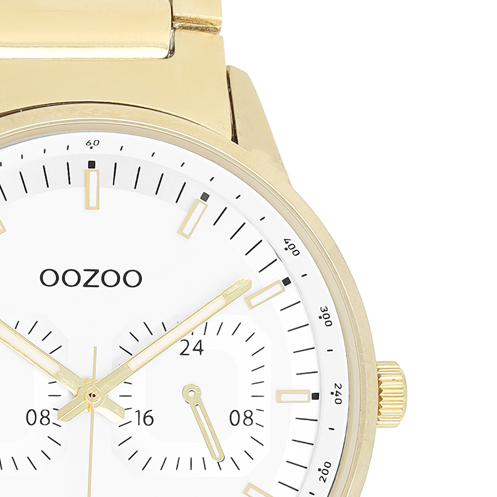 Stand out with this beautiful round gents design from the trendy OOZOO Timepieces collection. The C11623 has a gold coloured stainless steel bracelet and 42 mm gold coloured metal watch case. You are making quite the fashion statement with this white chrono dial, gold coloured/white stripes digits and matching hands. This essential watch for your wardrobe has a mineral glass, stainless steel backplate and is nickel safe. This watch has a 2ATM Japanese movement and is covered by a 2 year warranty (see section 3 of our Refund, shipping & warranty policy).