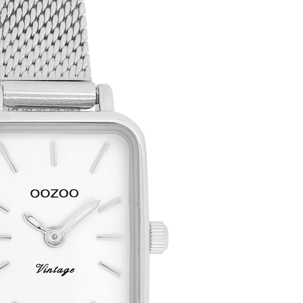 De klassieke look blijft centraal staan in deze trendy serie en daarom is dit OOZOO vintage rechthoekig design met een speelse knipoog dé musthave van het seizoen! Dit dames horloge is de perfecte combinatie van comfort en fashion met zijn 26x21 mm zilverkleurige metalen horlogekast en witte wijzerplaat. De wijzerplaat heeft zilverkleurige strepen tijdsaanduidingen en zilverkleurige kleurige wijzers. De zilverkleurige glanzende metalen mesh armband maakt dit horloge tot een trendy accessoire dat je elke dag kunt dragen. Dit horloge voegt de sprankeling toe aan je outfit. Het mineraalglas ligt in een 6,9 mm dunne metalen horlogekast met IP-plating. De C20266 heeft een stainless steel achterplaat en is nikkel-safe. Dit horloge heeft een 2 Japans uurwerk en wordt gedekt door een garantie van 2 jaar (zie sectie 3 van onze Refund, shipping & warranty policy).