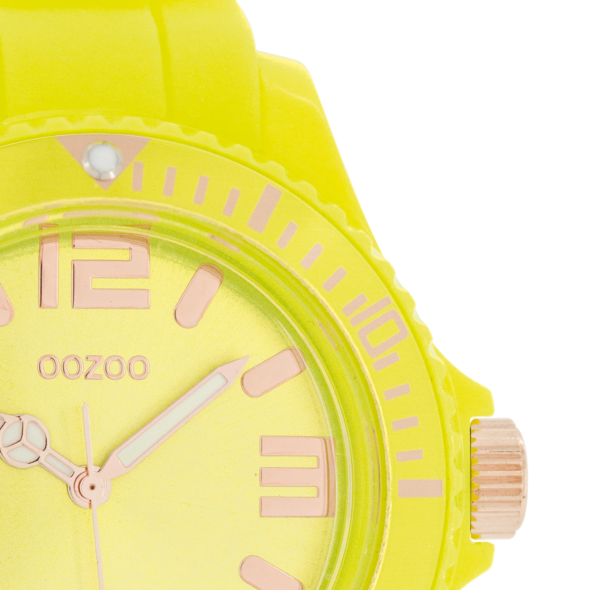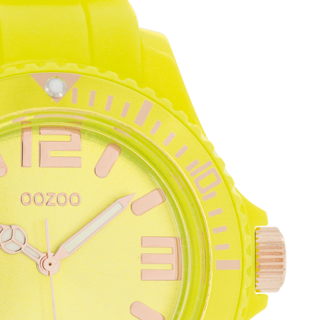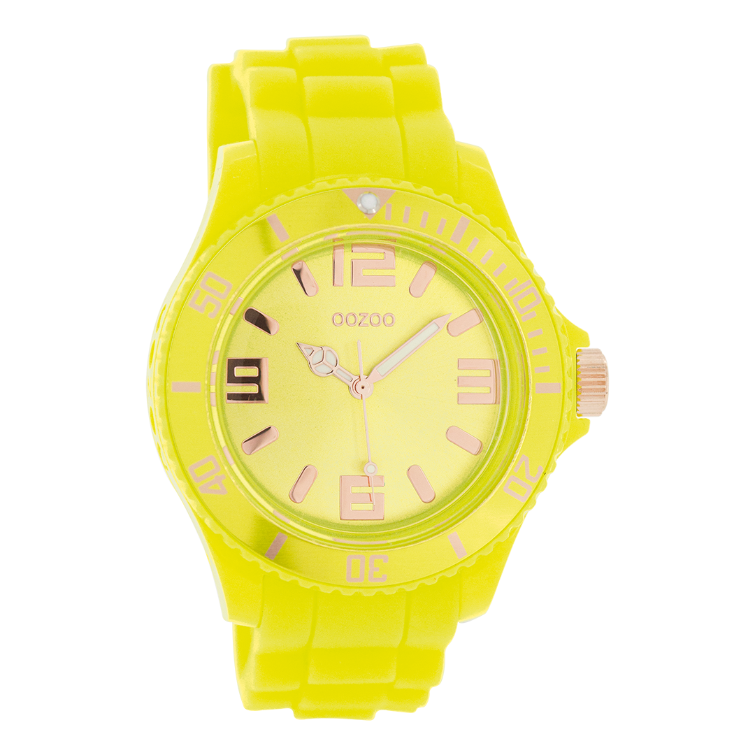 Val op met dit prachtige ronde unisex design uit de trendy OOZOO Timepieces collectie. De C5053 heeft een gele rubber band en 43 mm gele kunststof horlogekast. Maak een fashion statement met deze gele sunray wijzerplaat, rosé goudkleurige strepen en cijfers tijdsaanduidingen en rosé kleurig/witte wijzers. Dit horloge is een musthave voor jouw garderobe en heeft een mineraalglas, stainless steel achterplaat en is nikkel-safe. Dit horloge heeft een 2 Japanese uurwerk en wordt gedekt door een garantie van 2 jaar (zie sectie 3 van onze Refund, shipping & warranty policy).