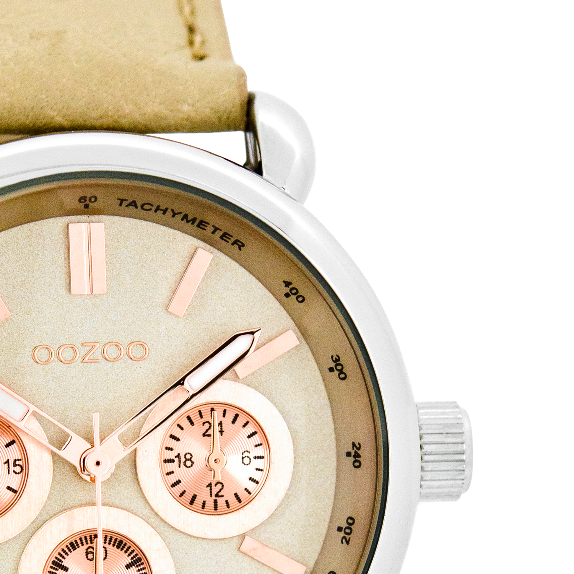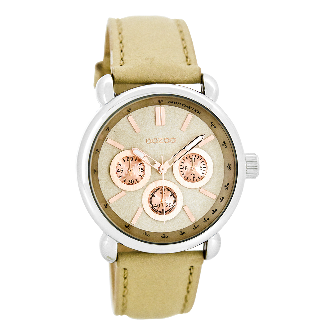 Val op met dit prachtige ronde dames design uit de trendy OOZOO Timepieces collectie. De C7135 heeft een gestikte zand leren band en 43 mm zilverkleurige metalen horlogekast. Maak een fashion statement met deze zand chrono/sunray wijzerplaat, rosé goudkleurige strepen tijdsaanduidingen en rosé kleurig/witte wijzers. Dit horloge is een musthave voor jouw garderobe en heeft een mineraalglas, stainless steel achterplaat en is nikkel-safe. Dit horloge heeft een 2 Japanese uurwerk en wordt gedekt door een garantie van 2 jaar (zie sectie 3 van onze Refund, shipping & warranty policy).
