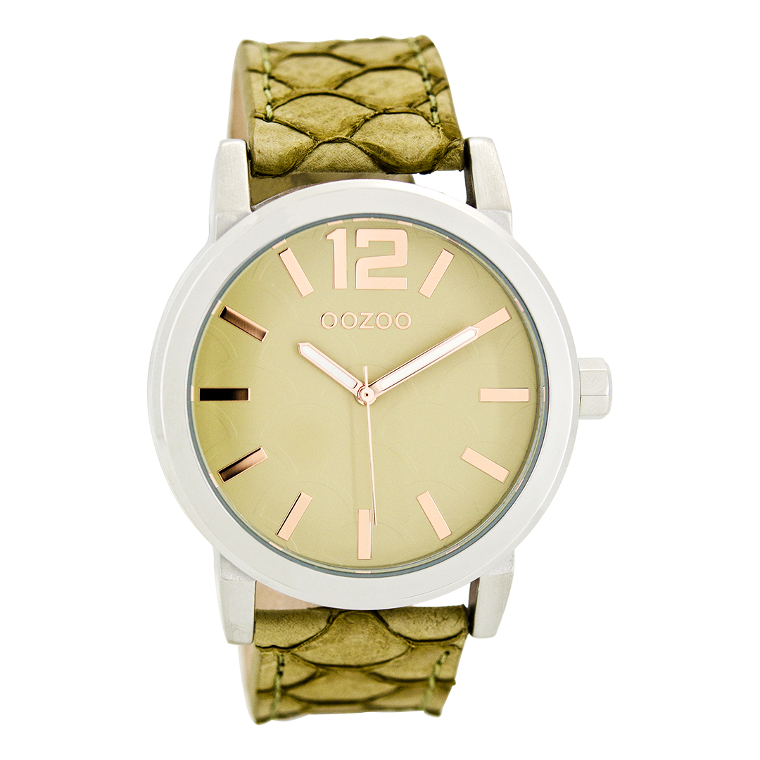 Val op met dit prachtige ronde dames design uit de trendy OOZOO Timepieces collectie. De C7995 heeft een slangen print zand/licht groene leren band en 43 mm zilverkleurige metalen horlogekast. Maak een fashion statement met deze zand wijzerplaat, rosé goudkleurige strepen en cijfers tijdsaanduidingen en rosé kleurig/witte wijzers. Dit horloge is een musthave voor jouw garderobe en heeft een mineraalglas, stainless steel achterplaat en is nikkel-safe. Dit horloge heeft een 2 Japanese uurwerk en wordt gedekt door een garantie van 2 jaar (zie sectie 3 van onze Refund, shipping & warranty policy).