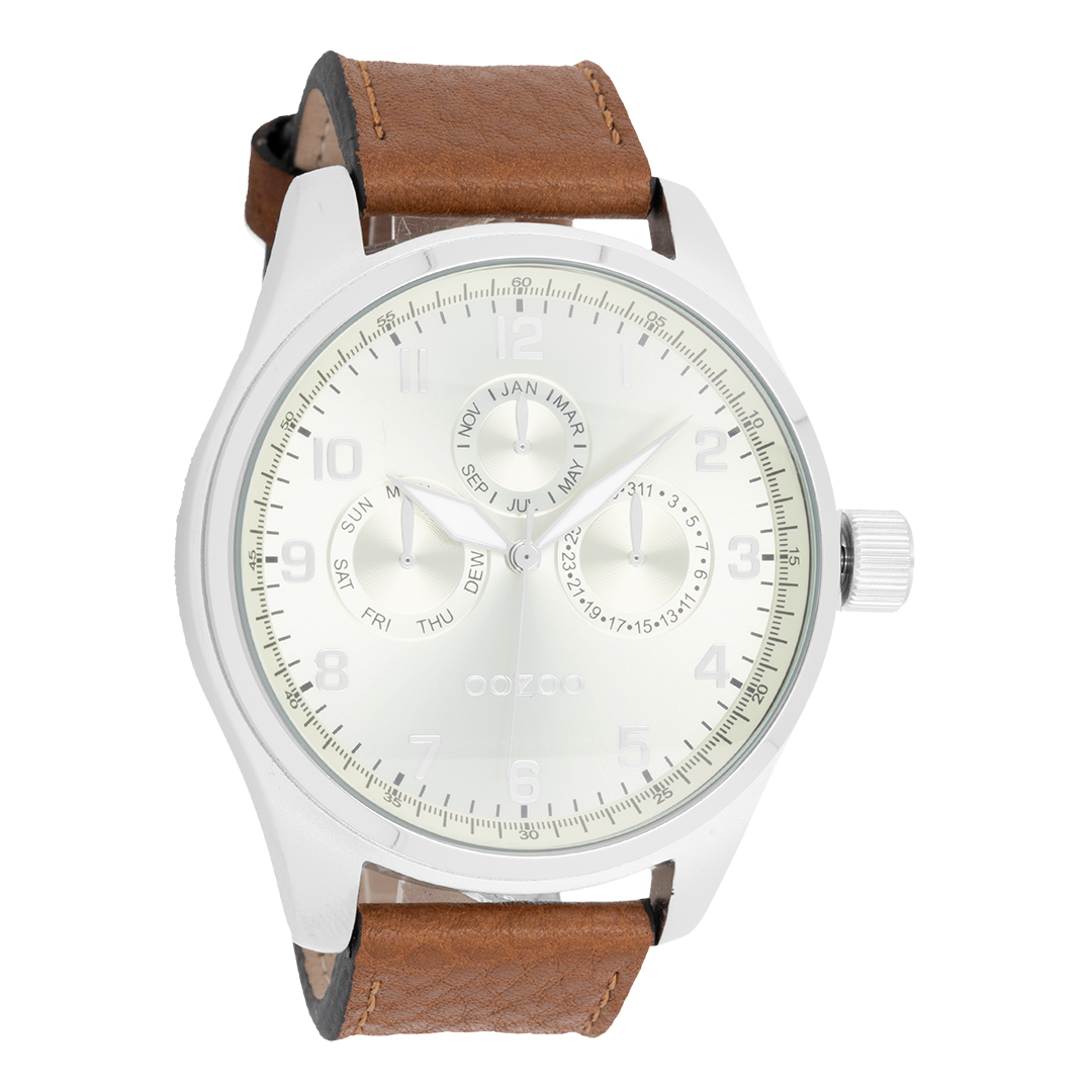 Zilverkleurige OOZOO horloge met cognac leren band - C8596