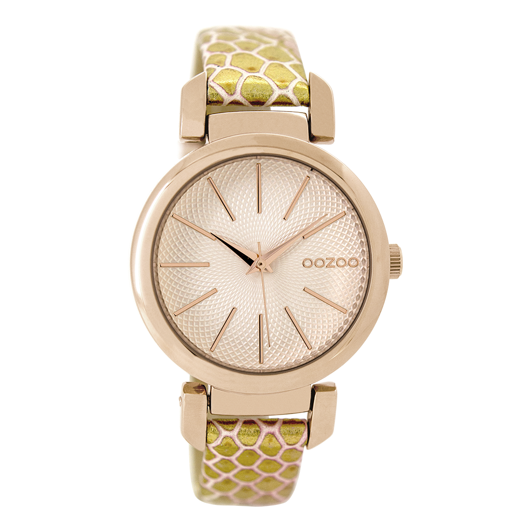 Val op met dit prachtige ronde dames design uit de trendy OOZOO Timepieces collectie. De C9487 heeft een slangen print goudkleurige leren band en 36 mm rosé goudkleurige metalen horlogekast. Maak een fashion statement met deze roze wijzerplaat, rosé goudkleurige strepen tijdsaanduidingen en bijpassende wijzers. Dit horloge is een musthave voor jouw garderobe en heeft een mineraalglas, stainless steel achterplaat en is nikkel-safe. Dit horloge heeft een 2 Japans uurwerk en wordt gedekt door een garantie van 2 jaar (zie sectie 3 van onze Refund, shipping & warranty policy).