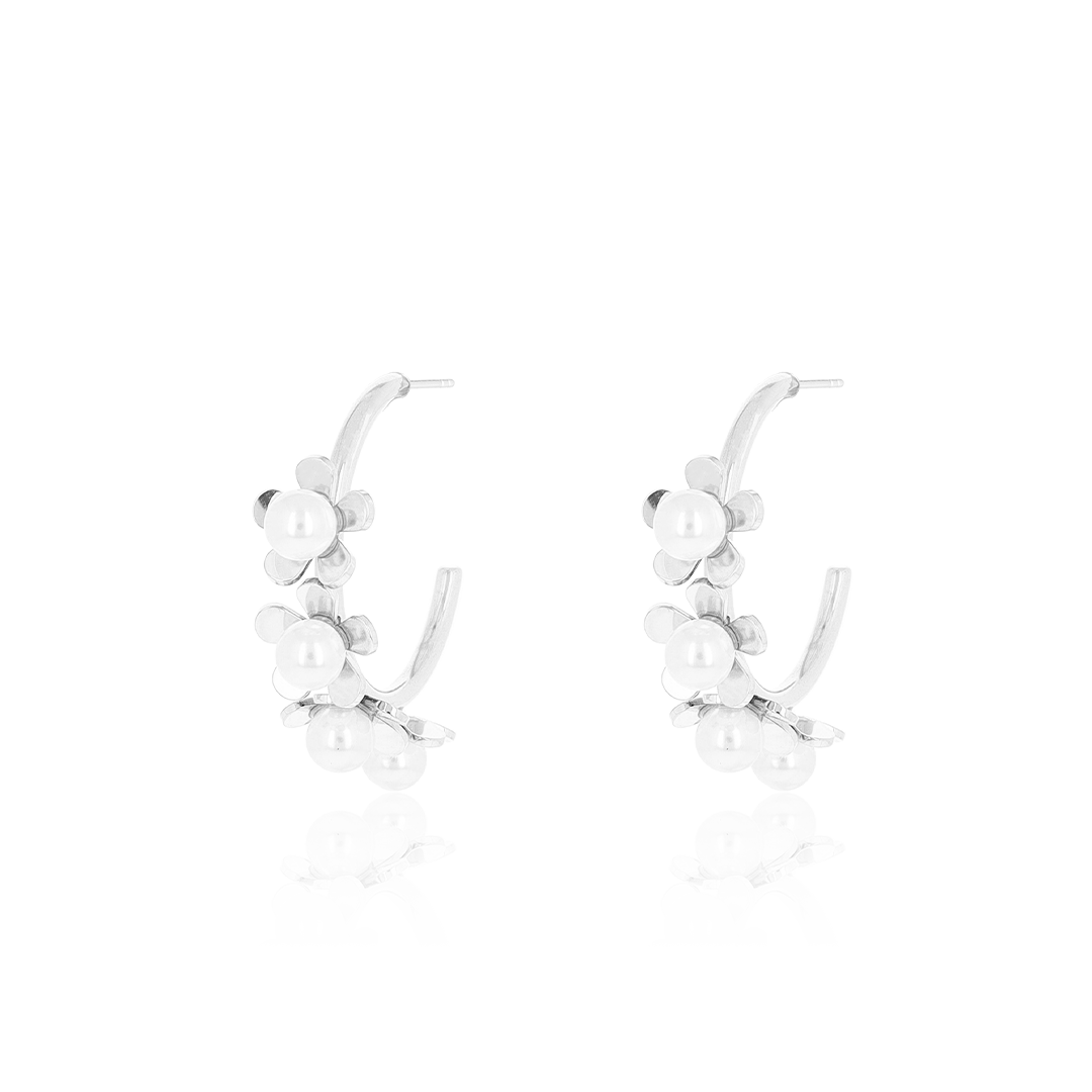 Zilverkleurige oorringen met parel bloemen