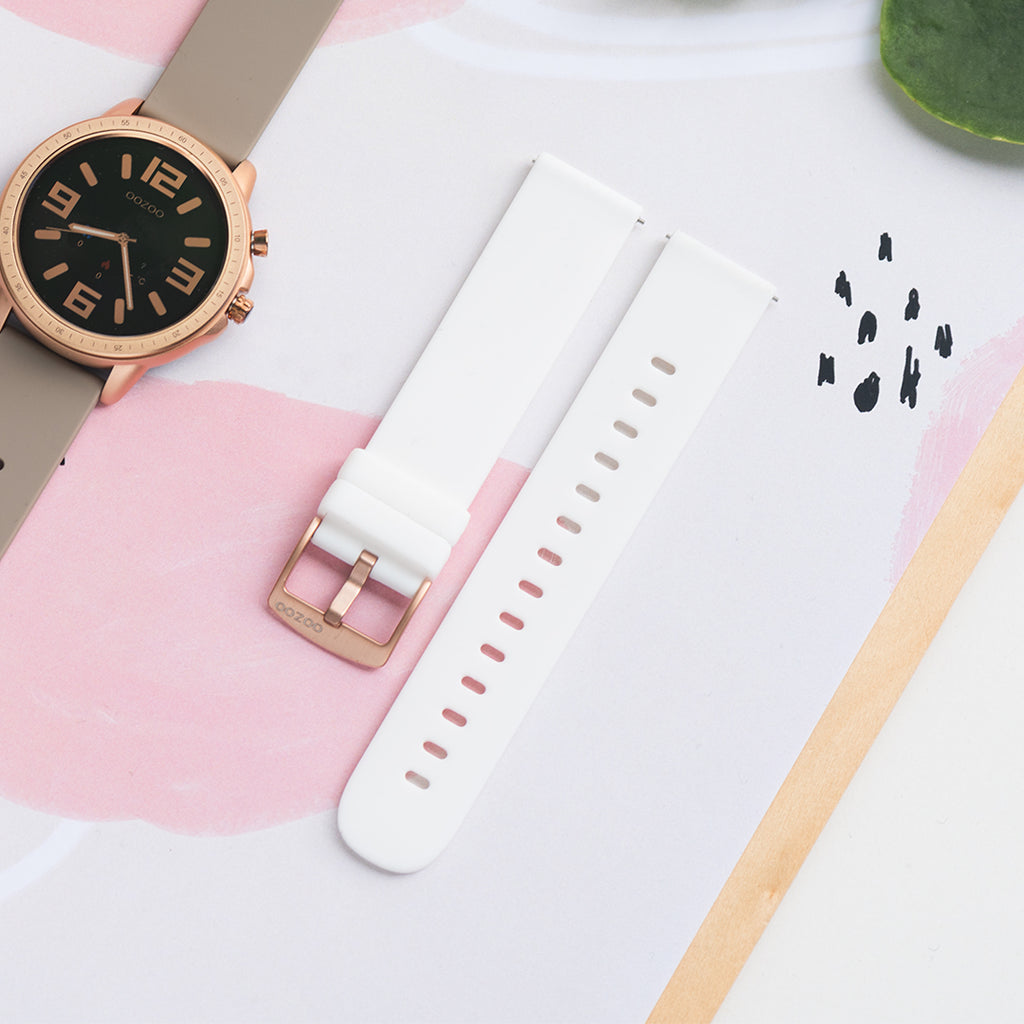 This ladies smartwatch watch strap gives you a totally new look! Switch the straps of your OOZOO Smartwatch for a difference of day and night. This matte white rubber strap with rose gold clasp gives your smartwatch a completely different style. Be smart, all day and all night. This strap fits OOZOO Smartwatch designs Q00110-122, Q00130-139 & Q00300-332. All straps have a stainless steel clasp and are nickel safe. (For information about the warranty, see section 3 of our Refund, shipping & warranty policy).