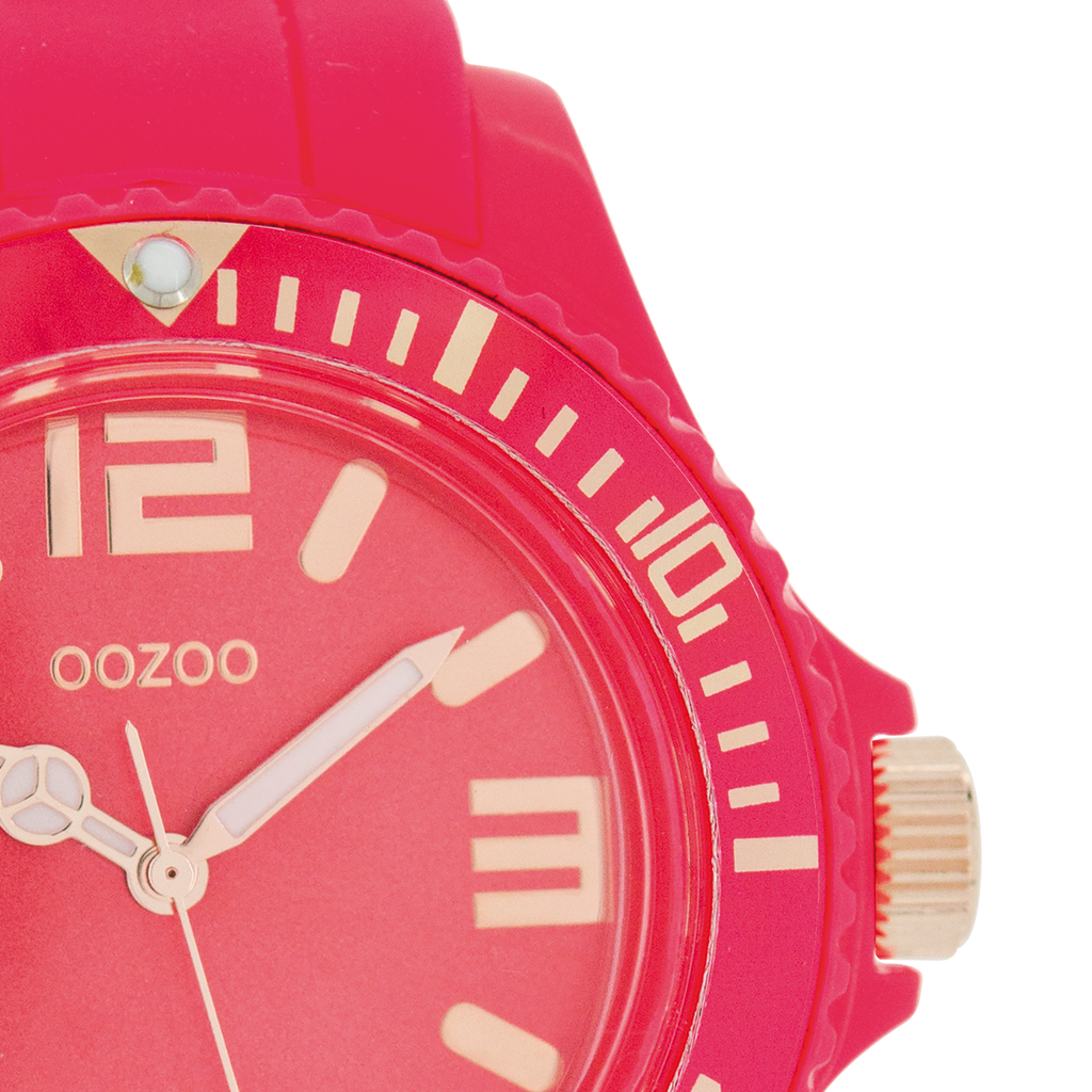 Stand out with this beautiful round unisex design from the trendy OOZOO Timepieces collection. The C5055 has a fluo pink rubber strap and 43 mm fluo pink plastic watch case. You are making quite the fashion statement with this fluo pink sunray dial, rose gold coloured stripes and numbers digits and rose gold coloured/white hands. This essential watch for your wardrobe has a mineral glass, stainless steel backplate and is nickel safe. This watch has a 2 Japanese movement and is covered by a 2 year warranty (see section 3 of our Refund, shipping & warranty policy).