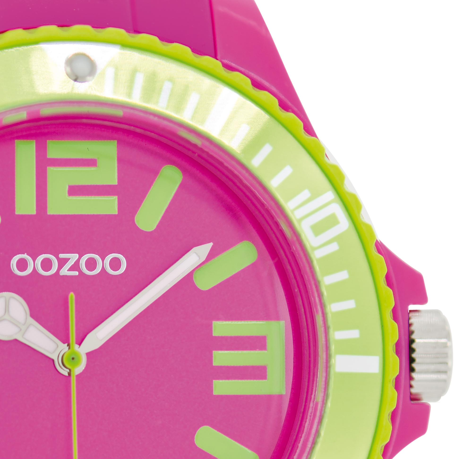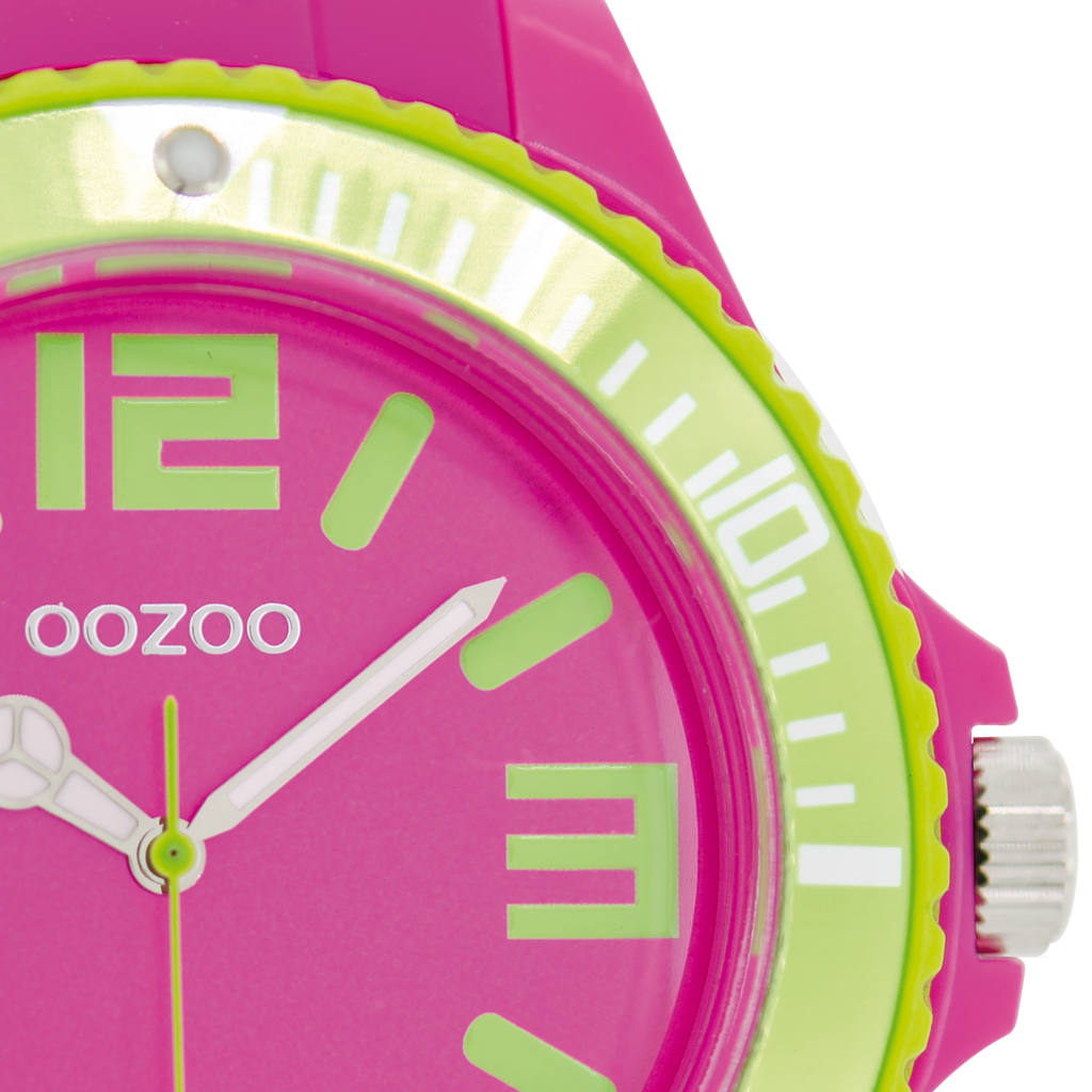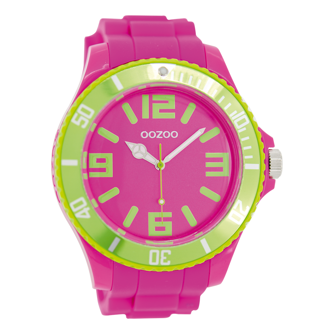 Stand out with this beautiful round unisex design from the trendy OOZOO Timepieces collection. The C5820 has a pink rubber strap and 48 mm pink plastic watch case. You are making quite the fashion statement with this pink dial, fluo green stripes and numbers digits and silver coloured/white hands. This essential watch for your wardrobe has a mineral glass, stainless steel backplate and is nickel safe. This watch has a 2 Japanese movement and is covered by a 2 year warranty (see section 3 of our Refund, shipping & warranty policy).
