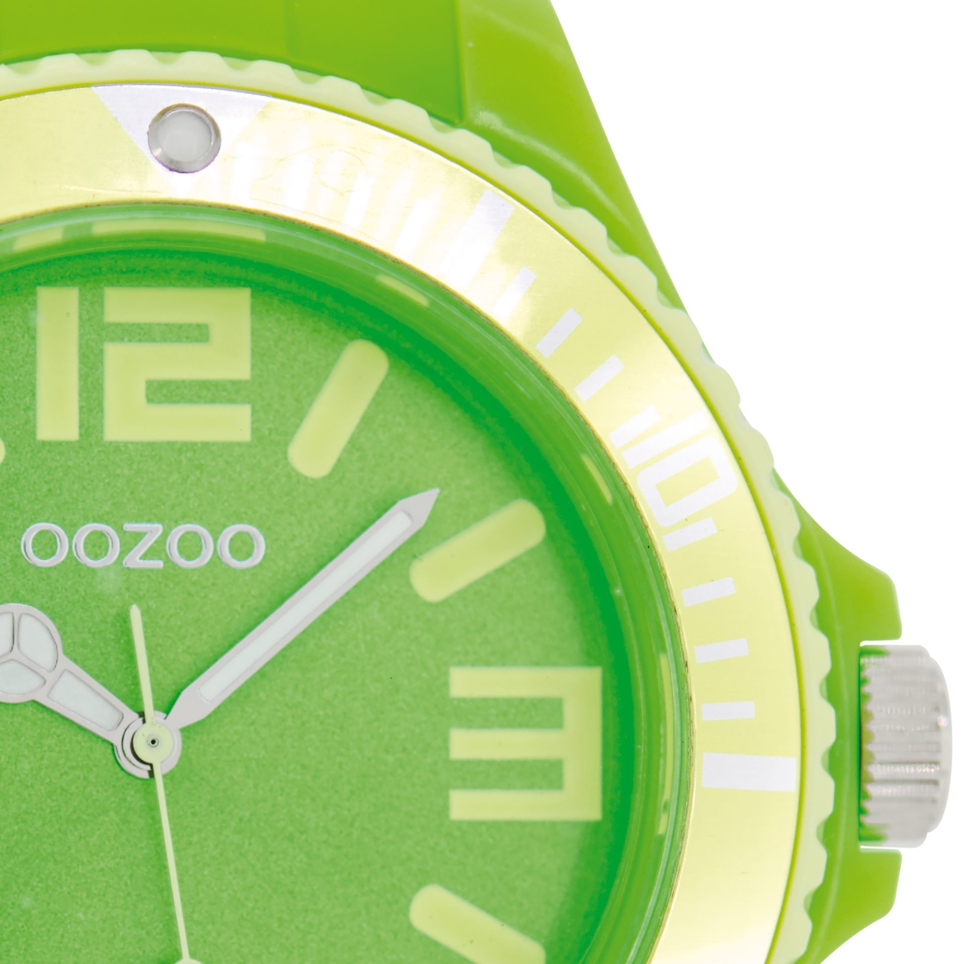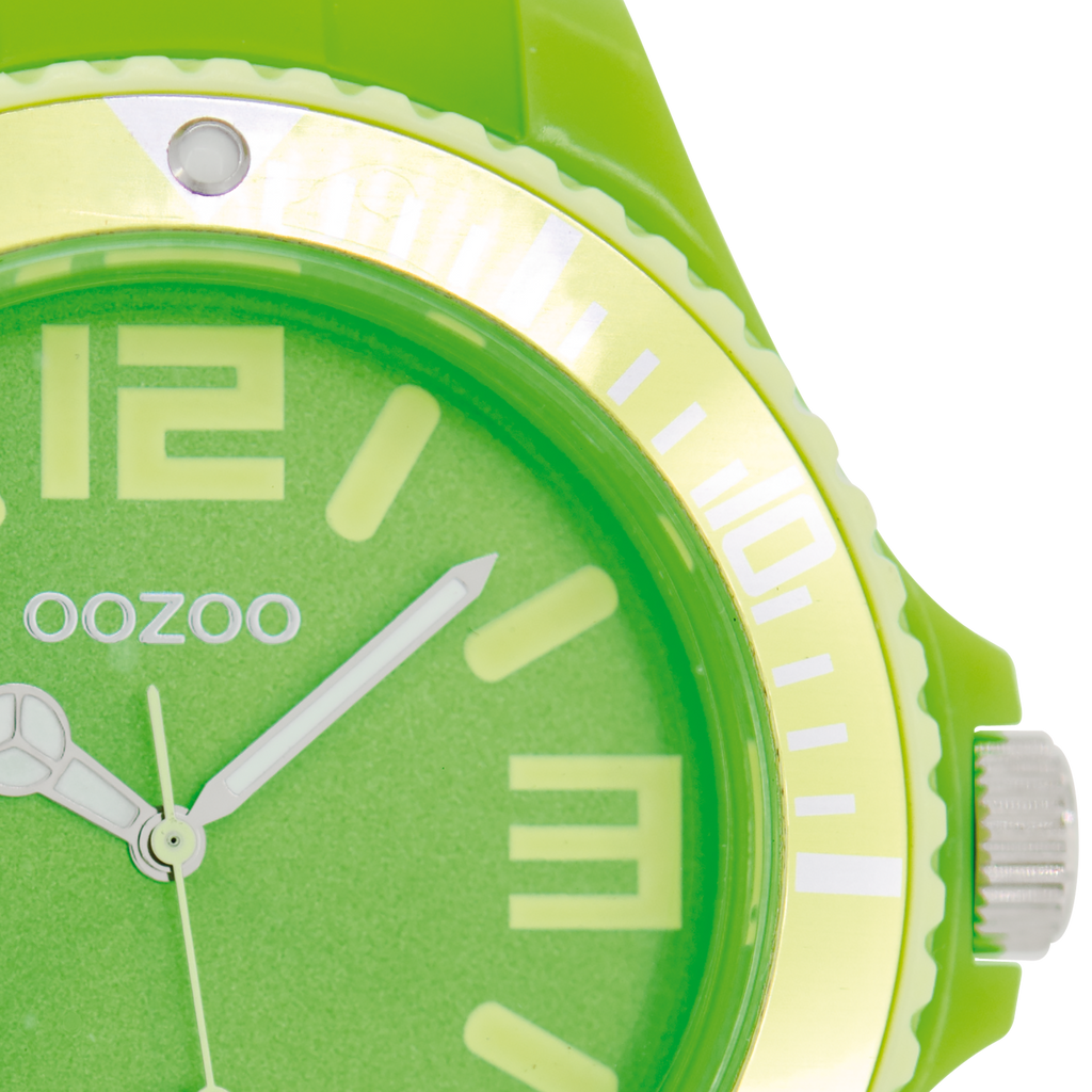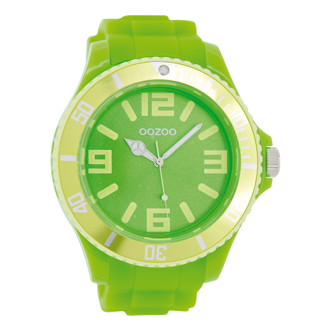 Stand out with this beautiful round unisex design from the trendy OOZOO Timepieces collection. The C5834 has a fluo green rubber strap and 48 mm fluo green plastic watch case. You are making quite the fashion statement with this fluo green dial, lime green stripes and numbers digits and silver coloured/white hands. This essential watch for your wardrobe has a mineral glass, stainless steel backplate and is nickel safe. This watch has a 2 Japanese movement and is covered by a 2 year warranty (see section 3 of our Refund, shipping & warranty policy).