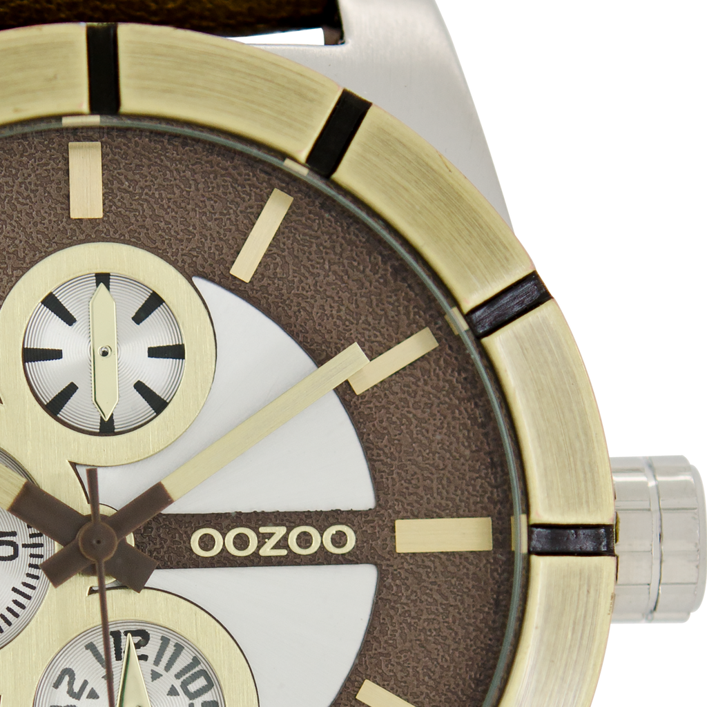 Silver coloured OOZOO watch with dark brown leather strap - C6433