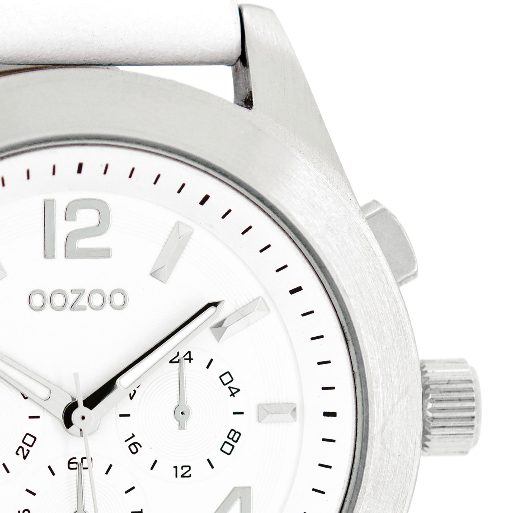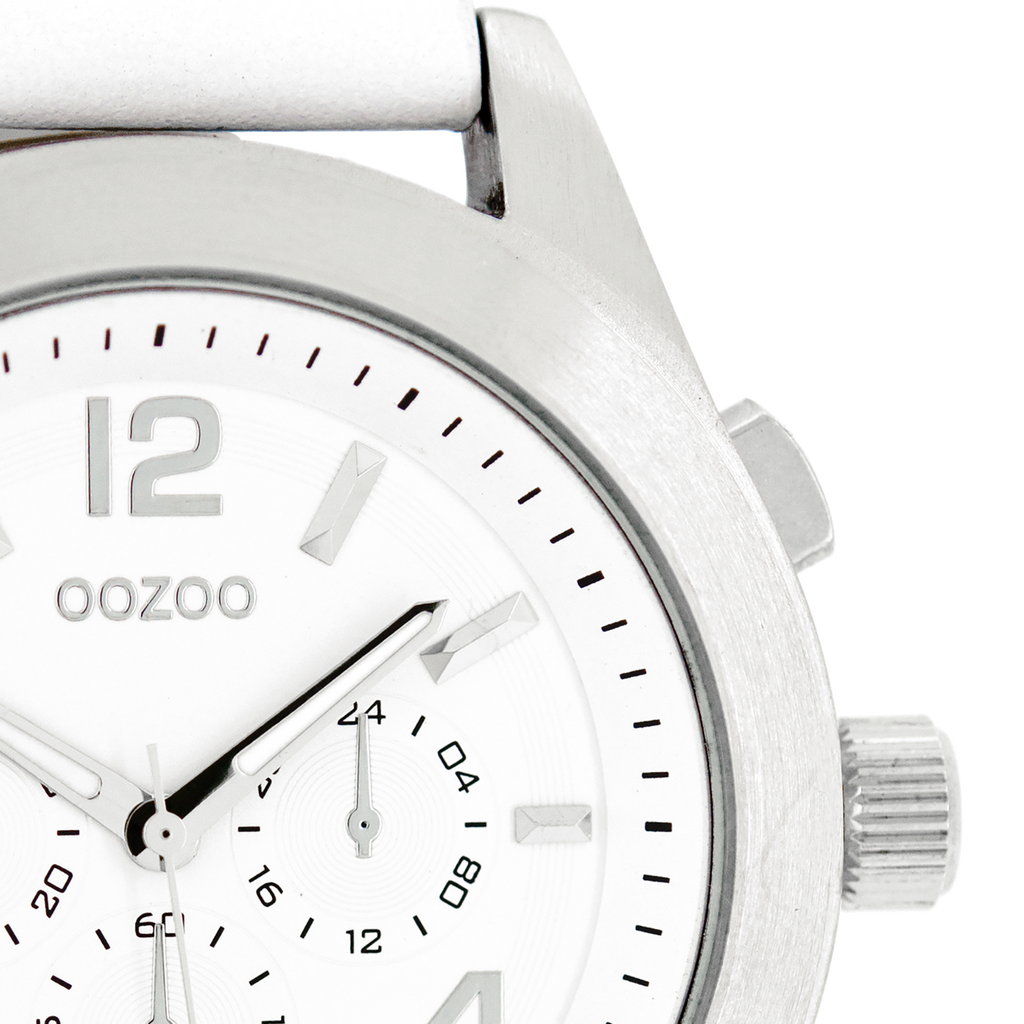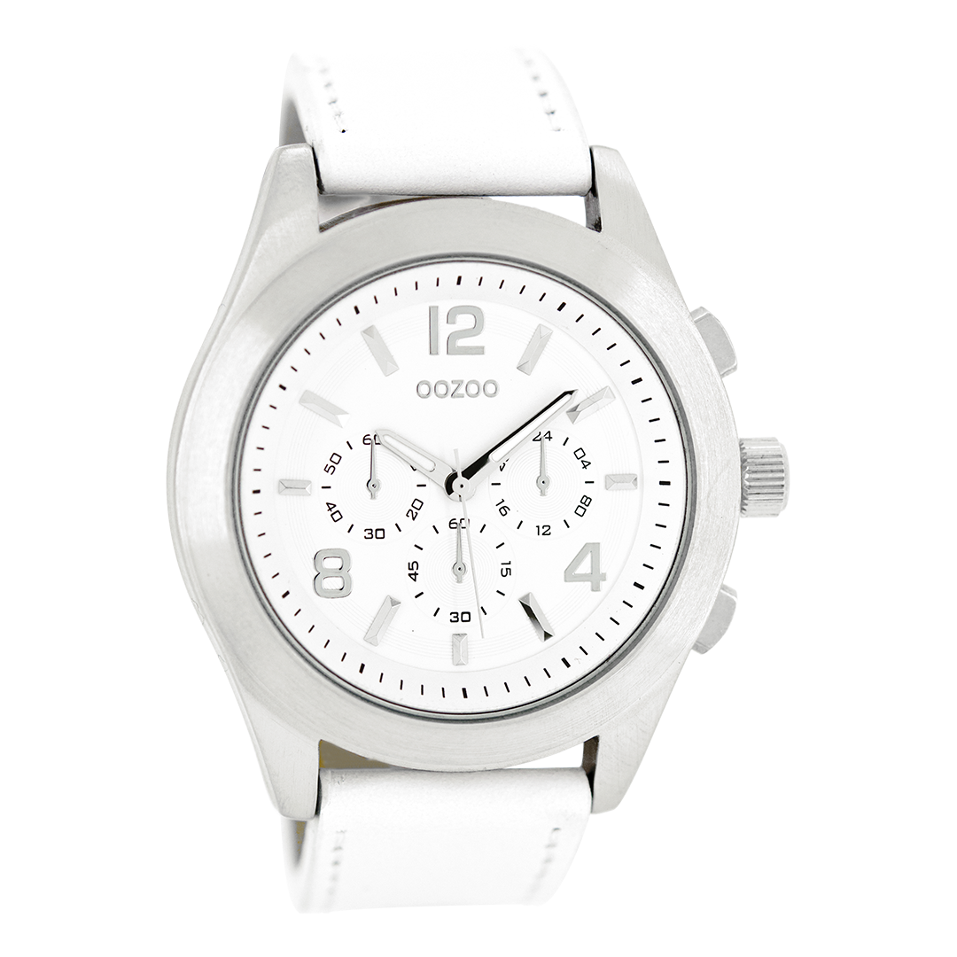 Stand out with this beautiful round ladies design from the trendy OOZOO Timepieces collection. The C6586 has a stitched white leather strap and 45 mm silver coloured metal watch case. You are making quite the fashion statement with this white chrono dial, silver coloured stripes and numbers digits and silver coloured/white hands. This essential watch for your wardrobe has a mineral glass, stainless steel backplate and is nickel safe. This watch has a 2 Japanese movement and is covered by a 2 year warranty (see section 3 of our Refund, shipping & warranty policy).
