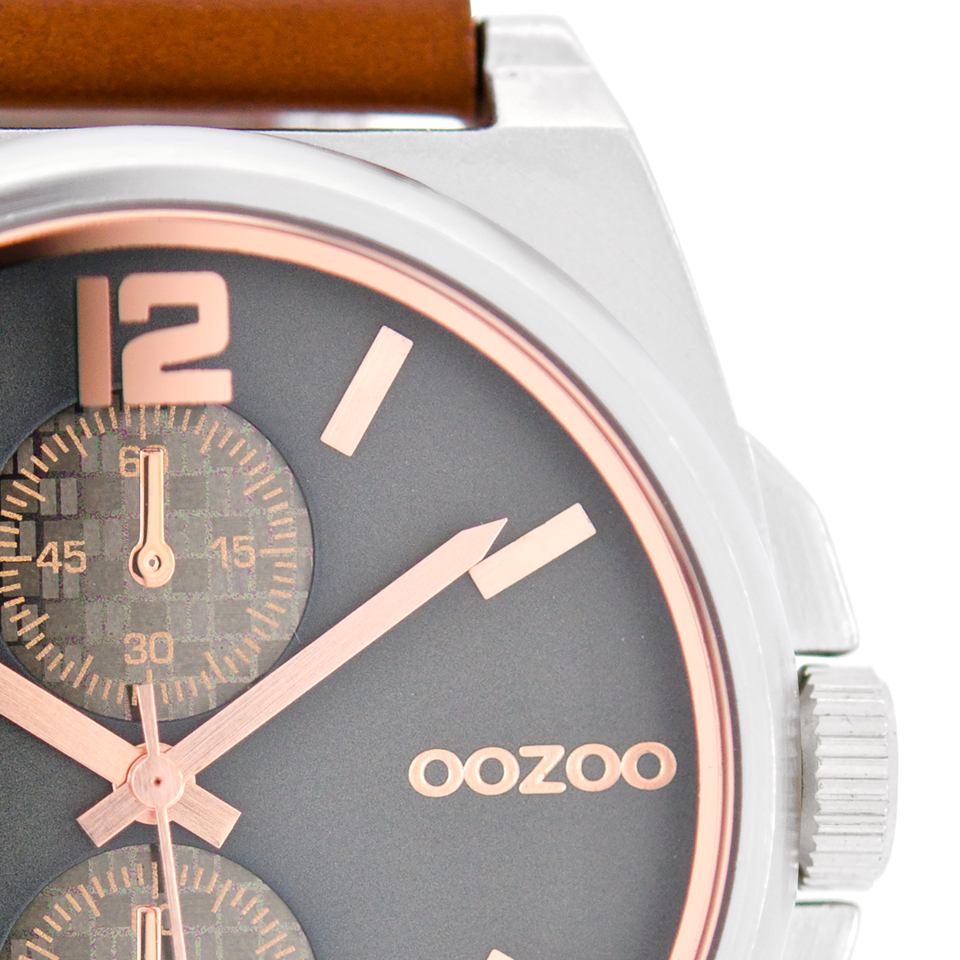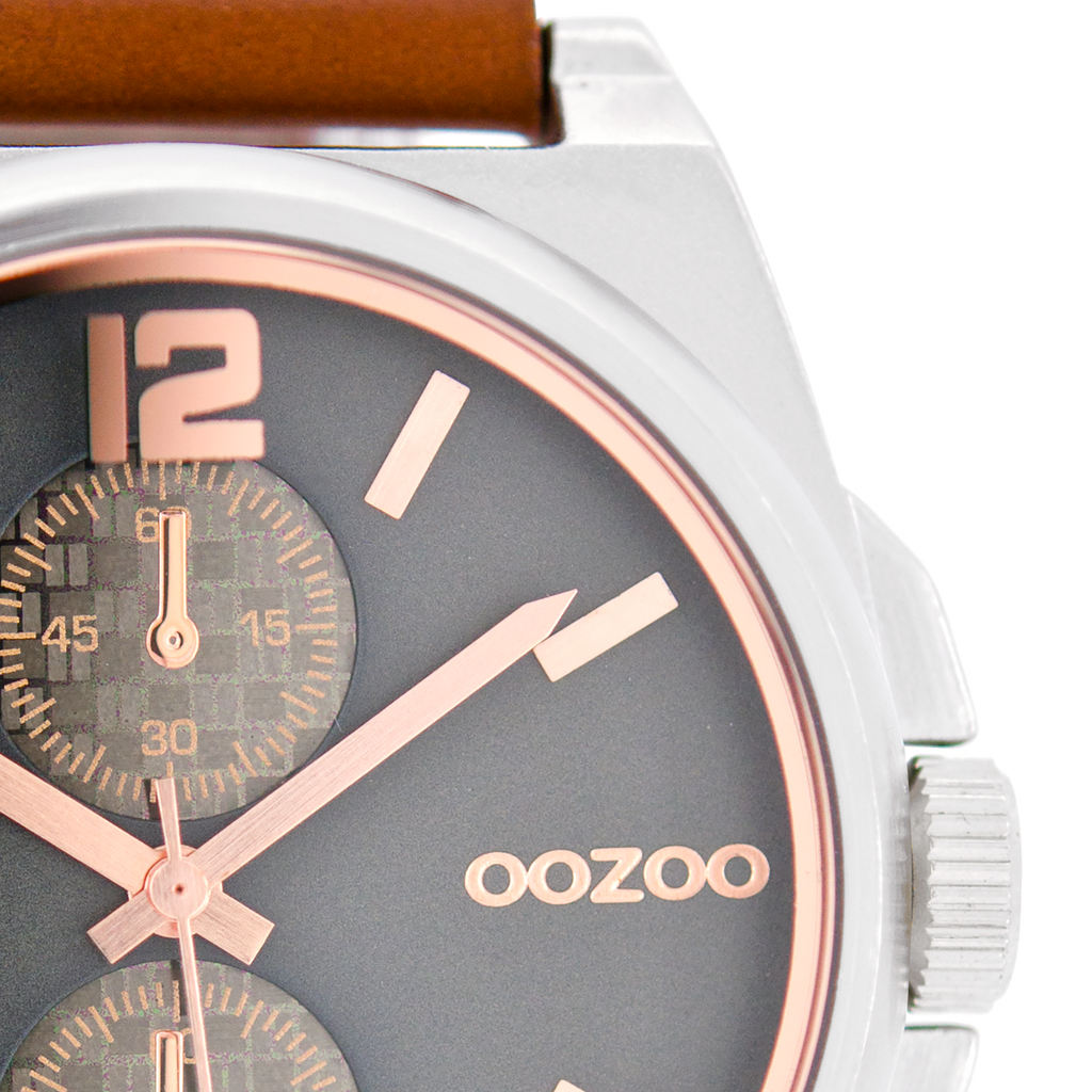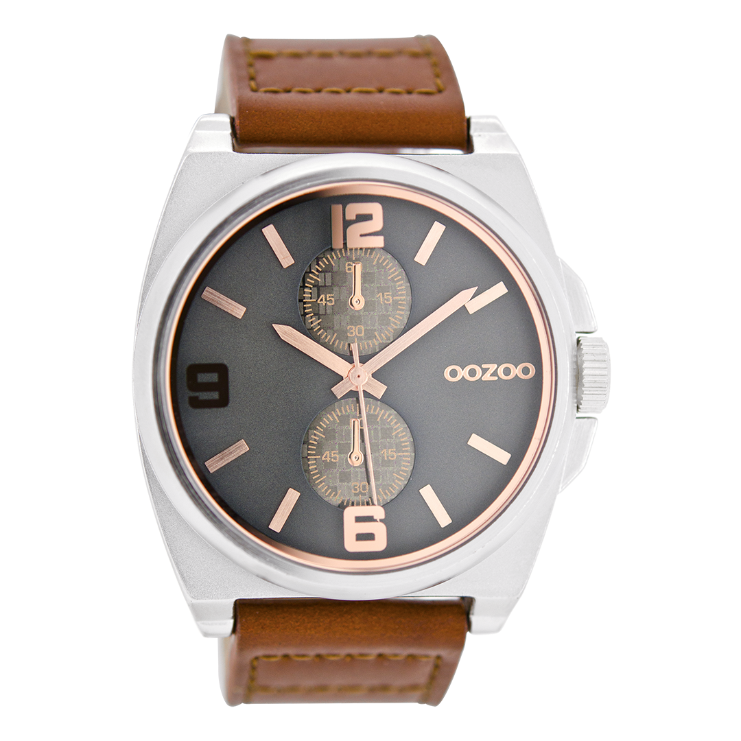 Stand out with this beautiful round gents design from the trendy OOZOO Timepieces collection. The C6757 has a stitched brown leather strap and 47 mm silver coloured metal watch case. You are making quite the fashion statement with this grey chrono dial, rose gold coloured stripes and numbers digits and matching hands. This essential watch for your wardrobe has a mineral glass, stainless steel backplate and is nickel safe. This watch has a 2 Japanese movement and is covered by a 2 year warranty (see section 3 of our Refund, shipping & warranty policy).