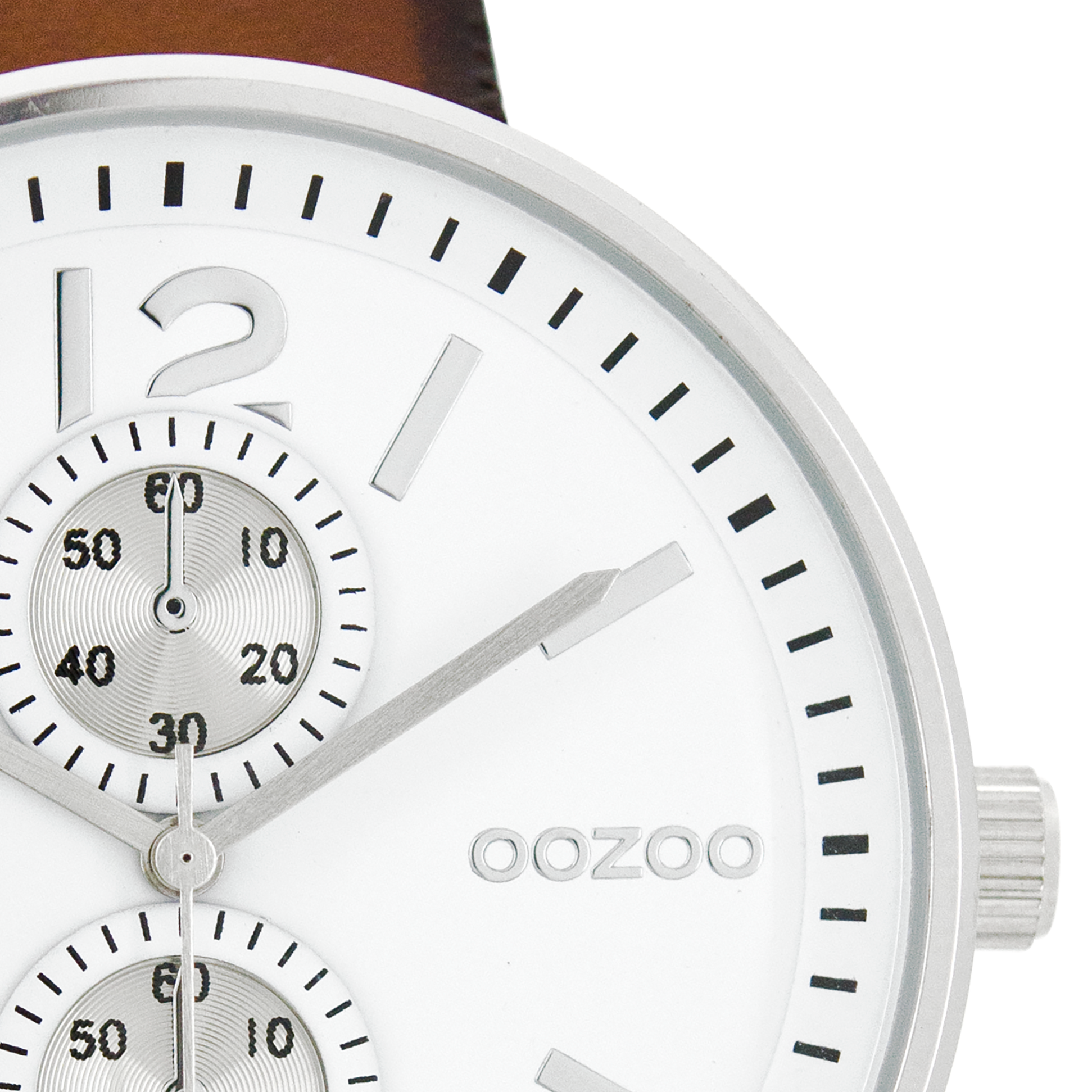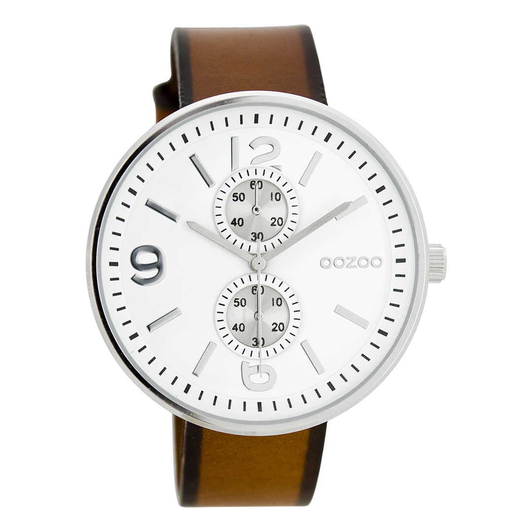 Stand out with this beautiful round gents design from the trendy OOZOO Timepieces collection. The C7076 has a cognac leather strap and 46 mm silver coloured metal watch case. You are making quite the fashion statement with this white chrono dial, silver coloured stripes and numbers digits and matching hands. This essential watch for your wardrobe has a mineral glass, stainless steel backplate and is nickel safe. This watch has a 2 Japanese movement and is covered by a 2 year warranty (see section 3 of our Refund, shipping & warranty policy).