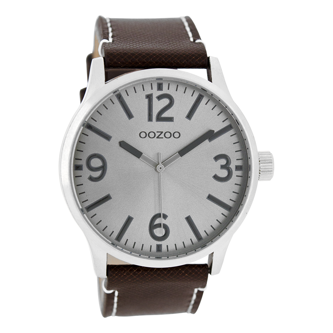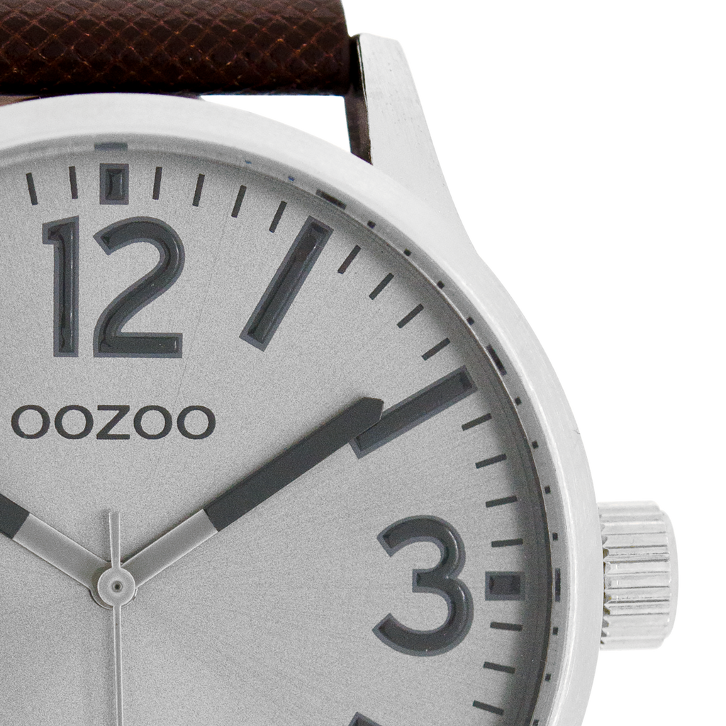 Silver coloured OOZOO watch with dark brown leather strap - C7407