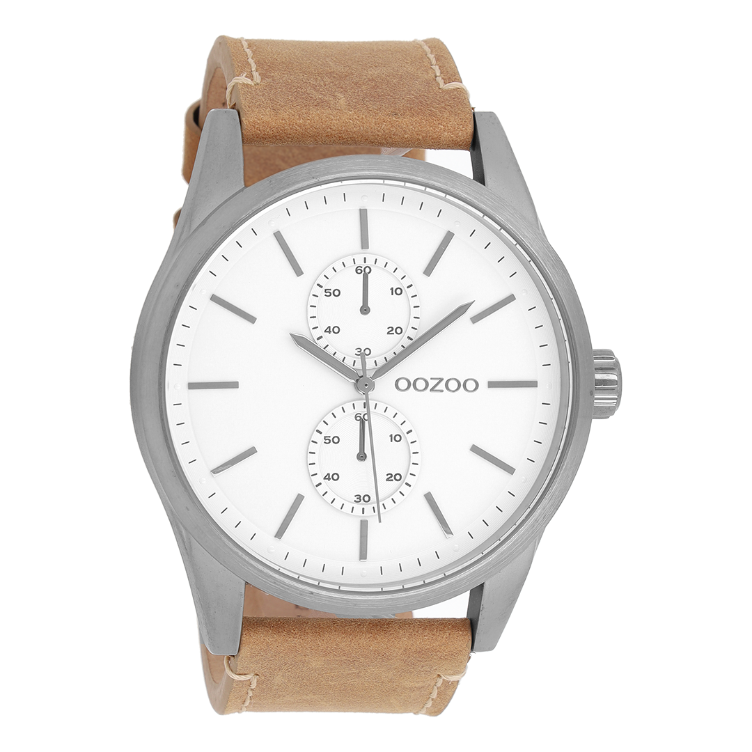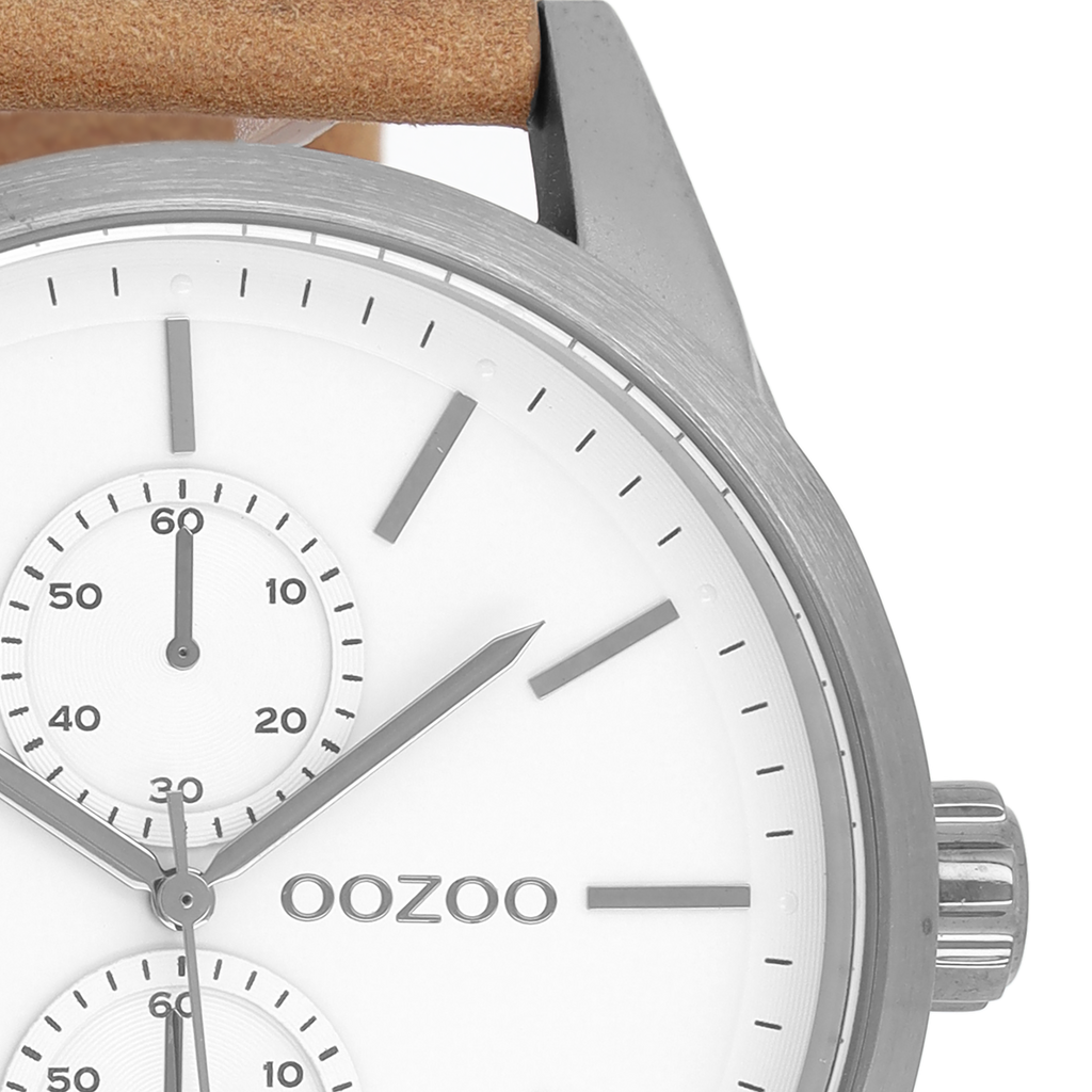Stand out with this beautiful round unisex design from the trendy OOZOO Timepieces collection. The C8510 has a brown leather strap and 50 mm titanium metal watch case. You are making quite the fashion statement with this white chrono dial, titanium stripes digits and matching hands. This essential watch for your wardrobe has a mineral glass, stainless steel backplate and is nickel safe. This watch has a 2 Japanese movement and is covered by a 2 year warranty (see section 3 of our Refund, shipping & warranty policy).