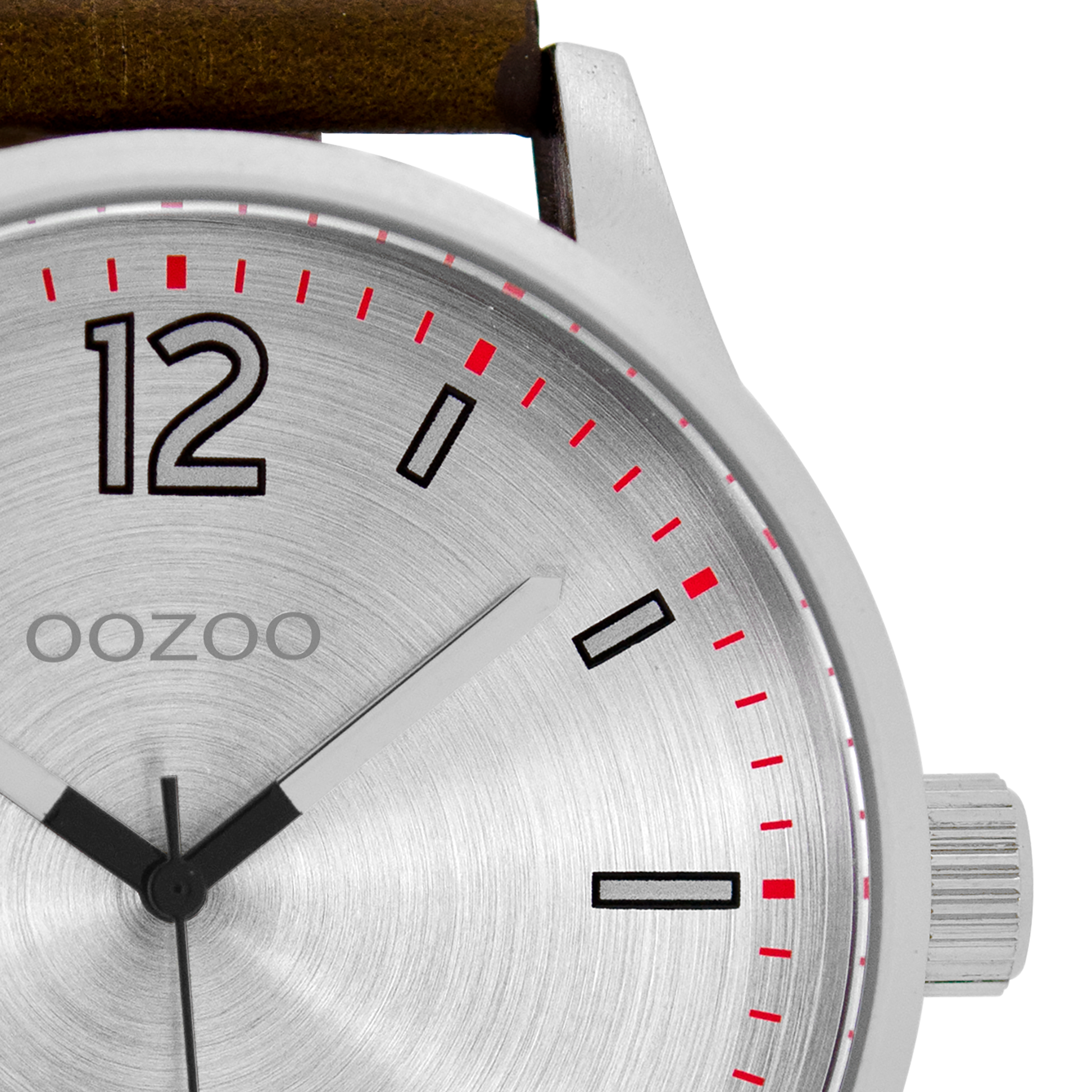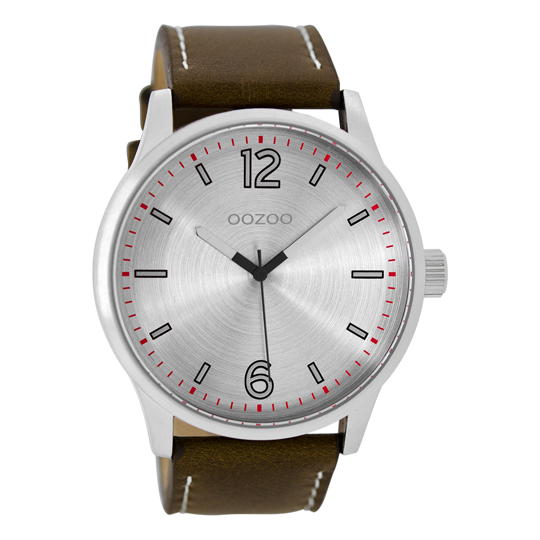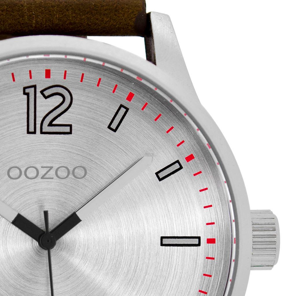 Silver coloured OOZOO watch with dark brown leather strap - C9048