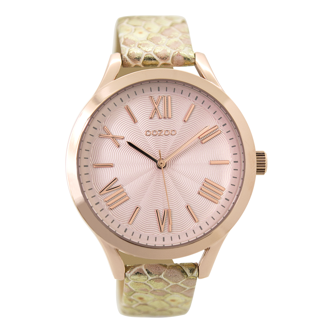 Stand out with this beautiful round ladies design from the trendy OOZOO Timepieces collection. The C9478 has a snake gold coloured leather strap and 42 mm rose gold coloured metal watch case. You are making quite the fashion statement with this pink dial, rose gold coloured stripes and roman numerals digits and matching hands. This essential watch for your wardrobe has a mineral glass, stainless steel backplate and is nickel safe. This watch has a 2 Japanese movement and is covered by a 2 year warranty (see section 3 of our Refund, shipping & warranty policy).