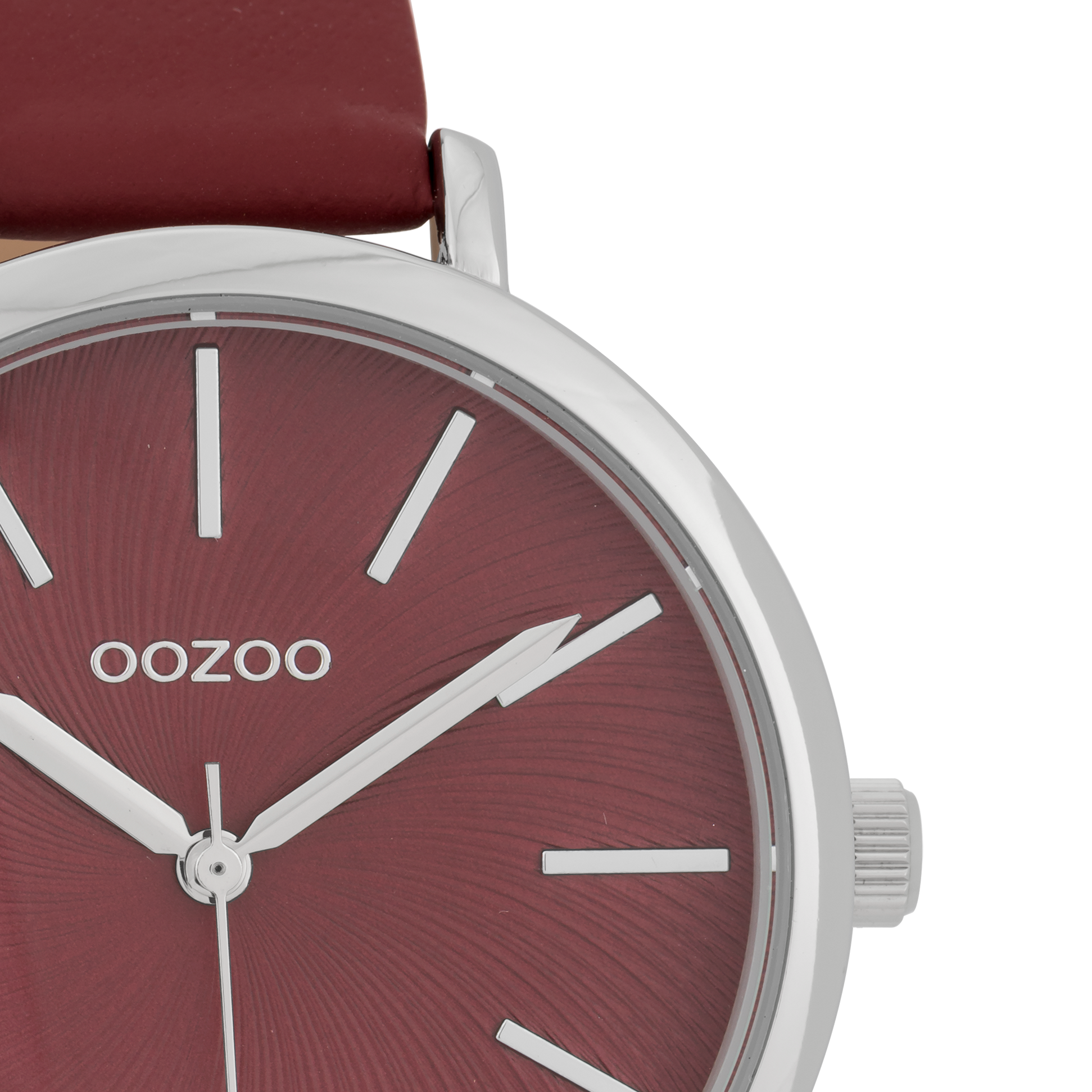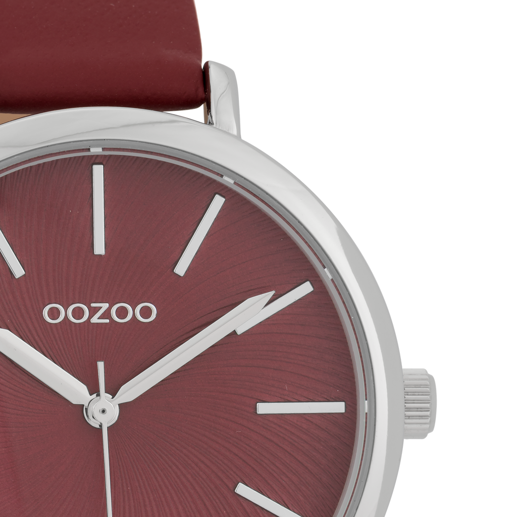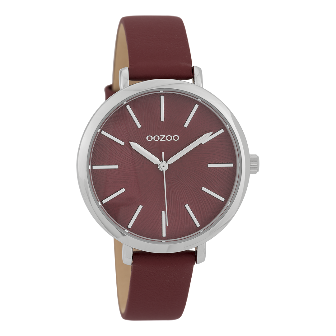 Silver coloured OOZOO watch with burgundy leather strap - C9698